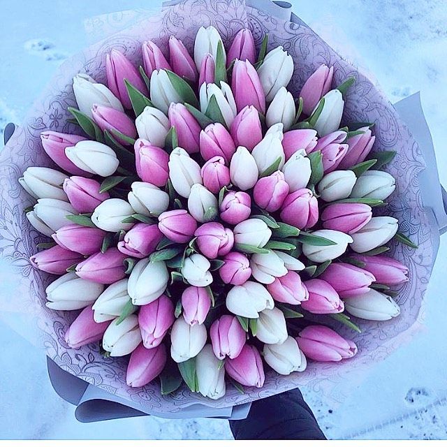 Сто один тюльпан в бело-розовой палитре создаёт яркое впечатление с первого взгляда. Микс оттенков формирует живую текстуру и воздушный объём композиции.