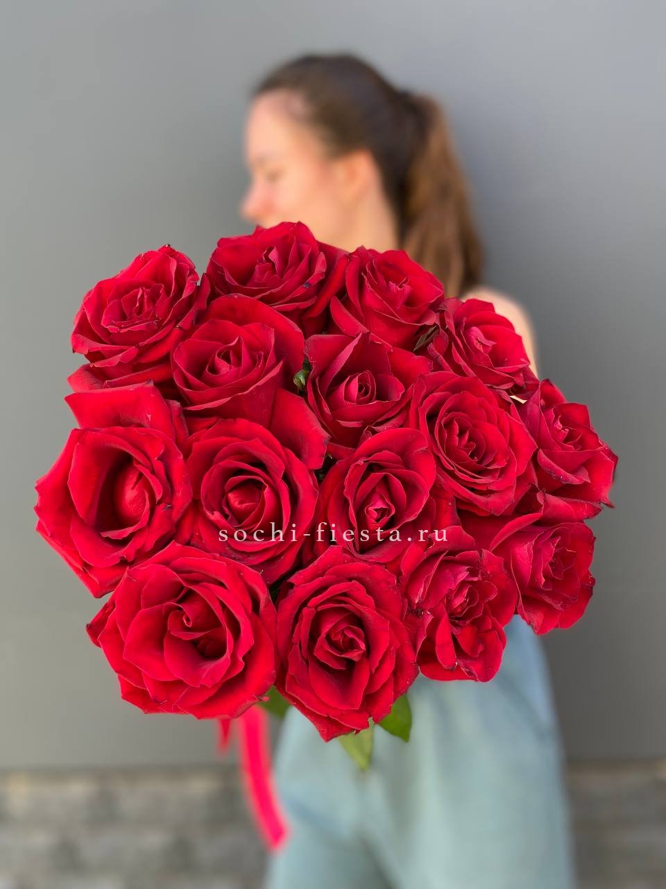 Красные головки роз собраны в плотную композицию с насыщенным цветовым пятном. Лаконичная лента фиксирует букет и добавляет завершённость всей форме.