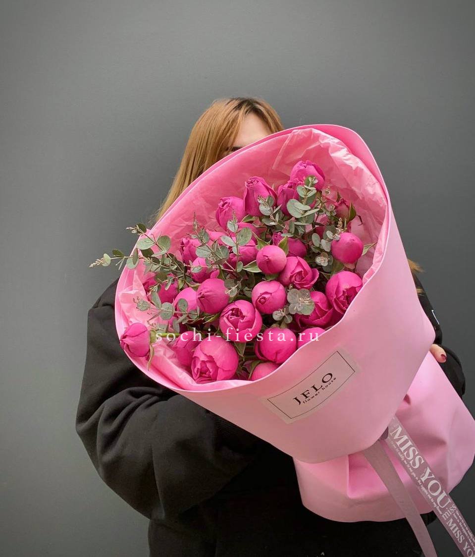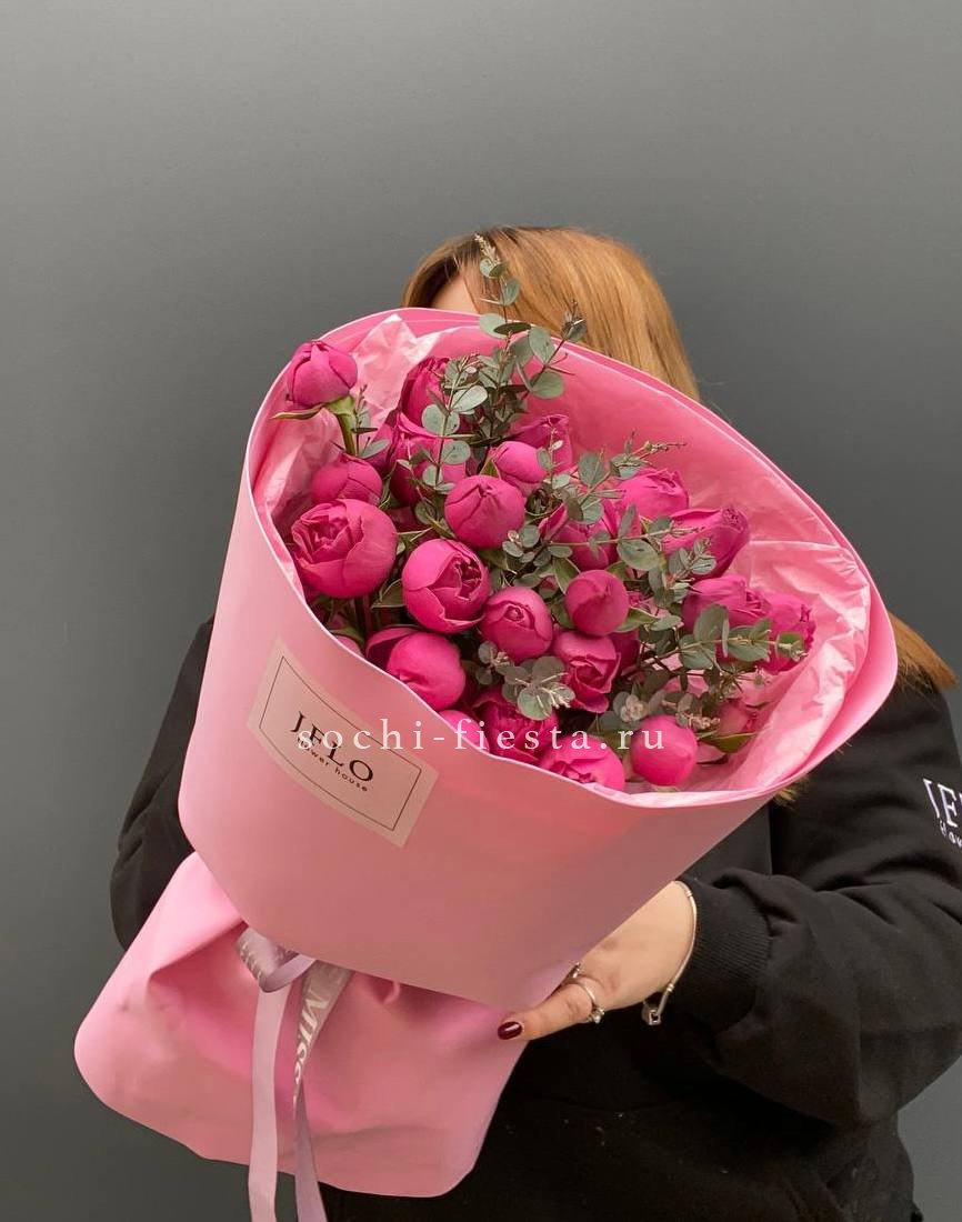 пионовидная кустовая кустовая роза Мисти Баблс, статица, лента, дизайнерская упаковка.