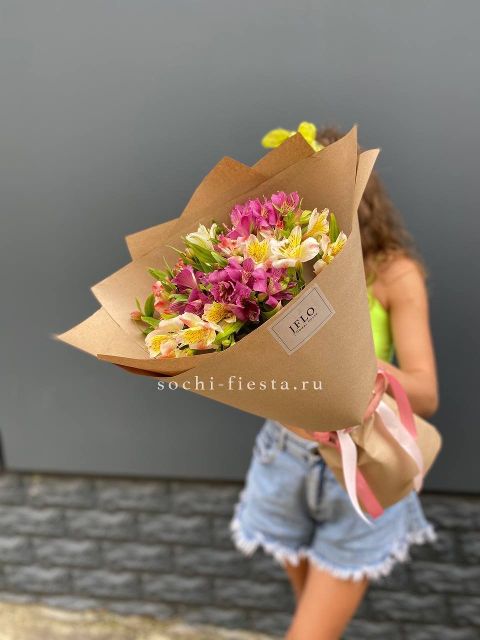 Девять веток альстромерий собраны в свободную композицию и обернуты натуральным крафтом. Естественная форма с лёгким наклоном линий создаёт живое и непринуждённое впечатление.