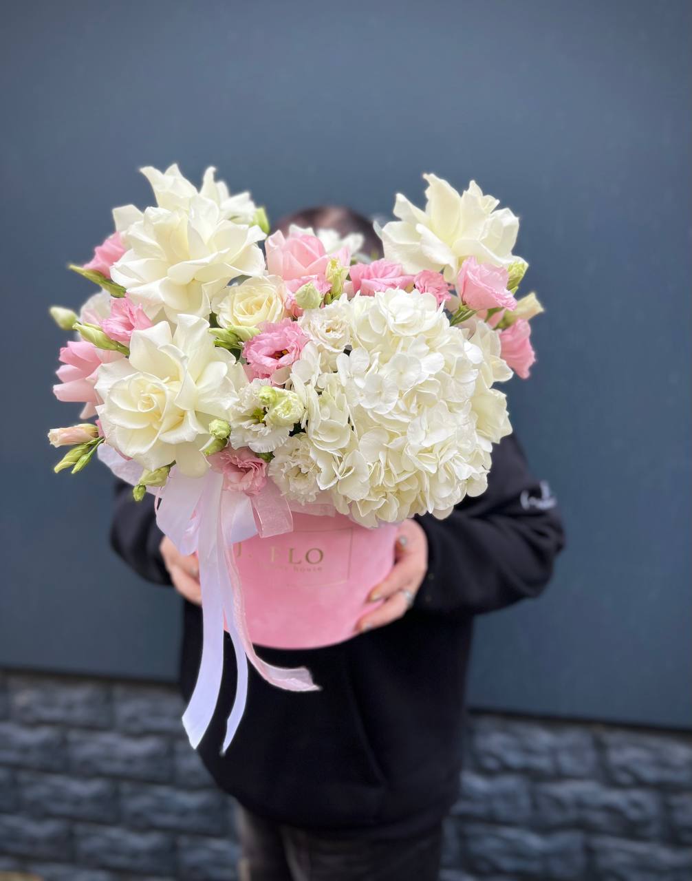 эустома, розы, пионовидные розы, озотамнус или аналог, диантусы, макаронс, декоративная зелень, коробка-сердце.