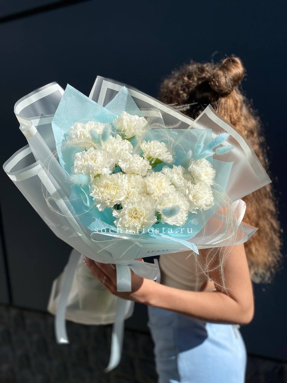 хризантема, маттиола, диантусы, розы с элементами бусин в воздушном оформлении.