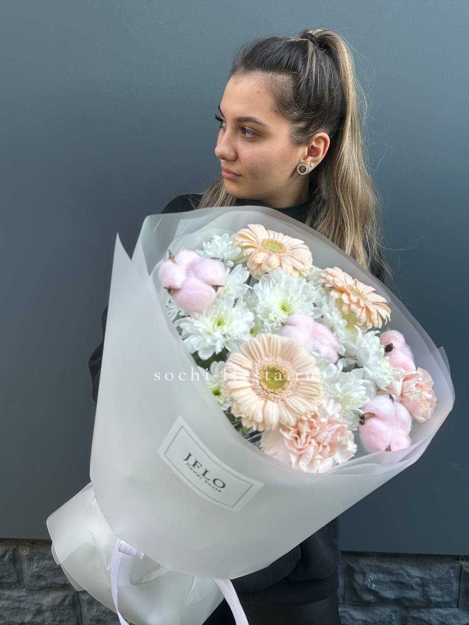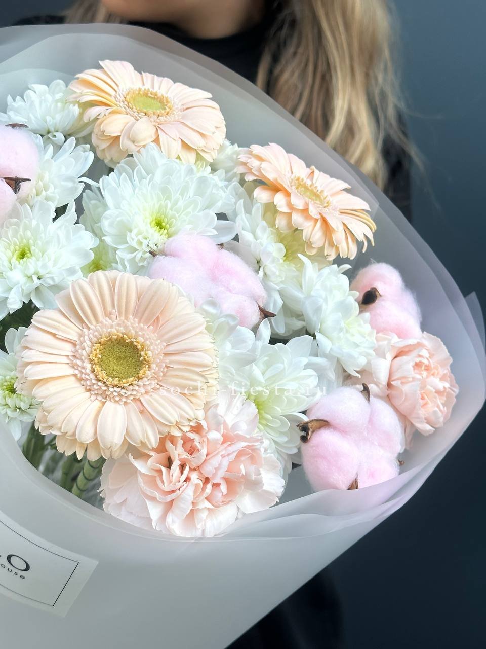 Белоснежные розы и герберы соседствуют с пушистыми шапками хризантем и воздушной статицей. Хлопок добавляет фактурный акцент, делая композицию объёмной и запоминающейся.