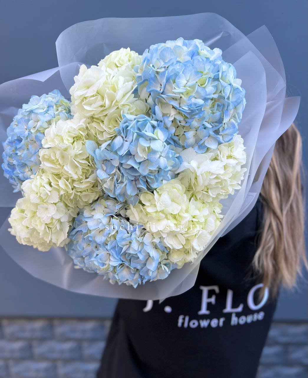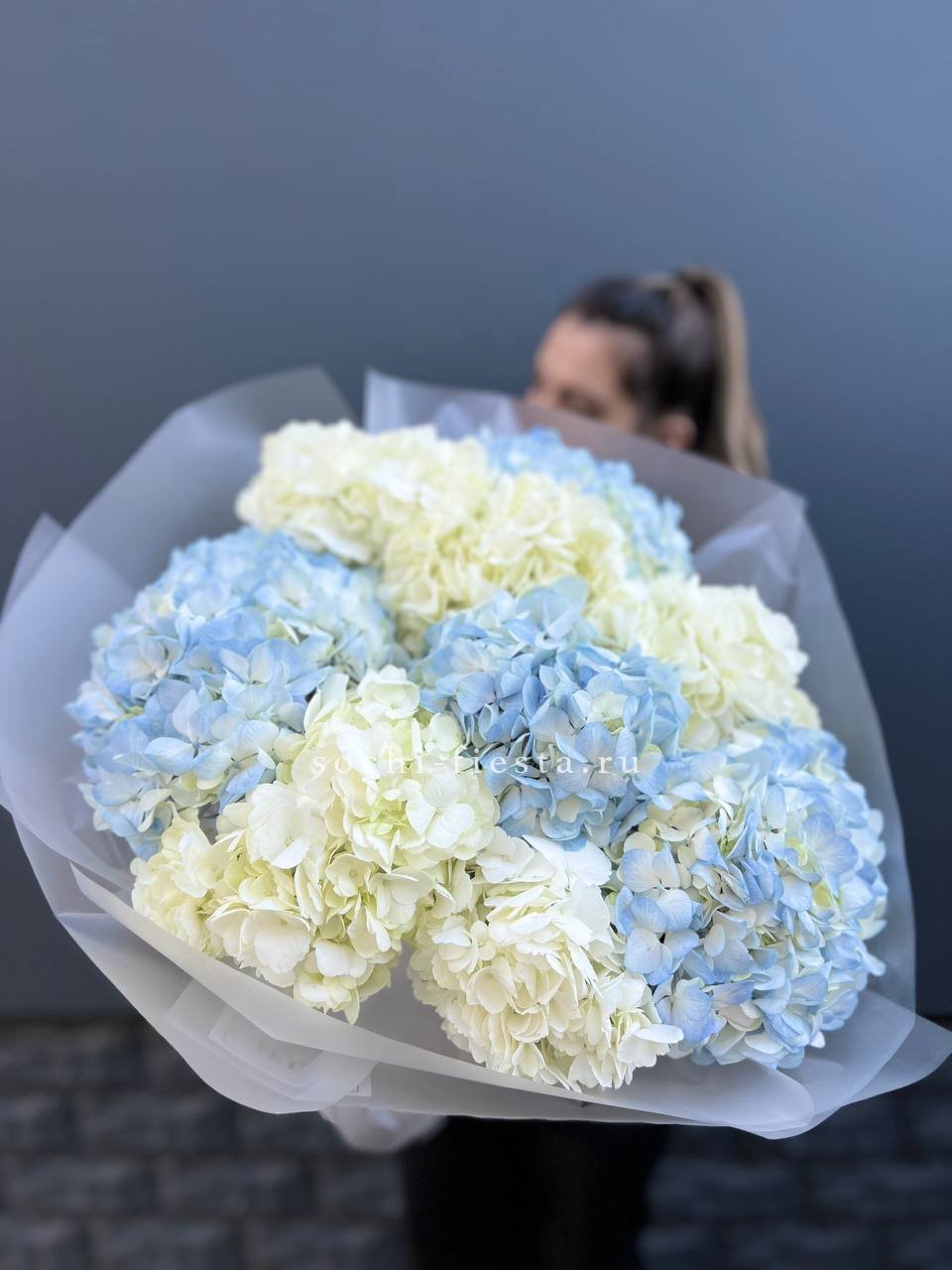 гортензия, хризантема, белая роза, гербера, статица, хлопок, упаковка.