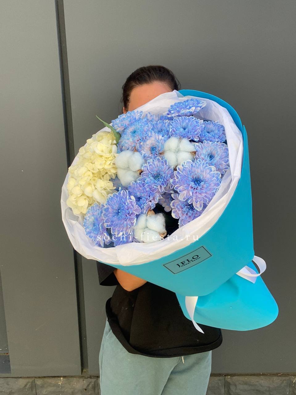 Асимметричная форма напоминает изгиб полумесяца: кустовая хризантема и гортензия собраны в плавную линию. Коробочки хлопка смягчают силуэт и добавляют фактурности краям букета.