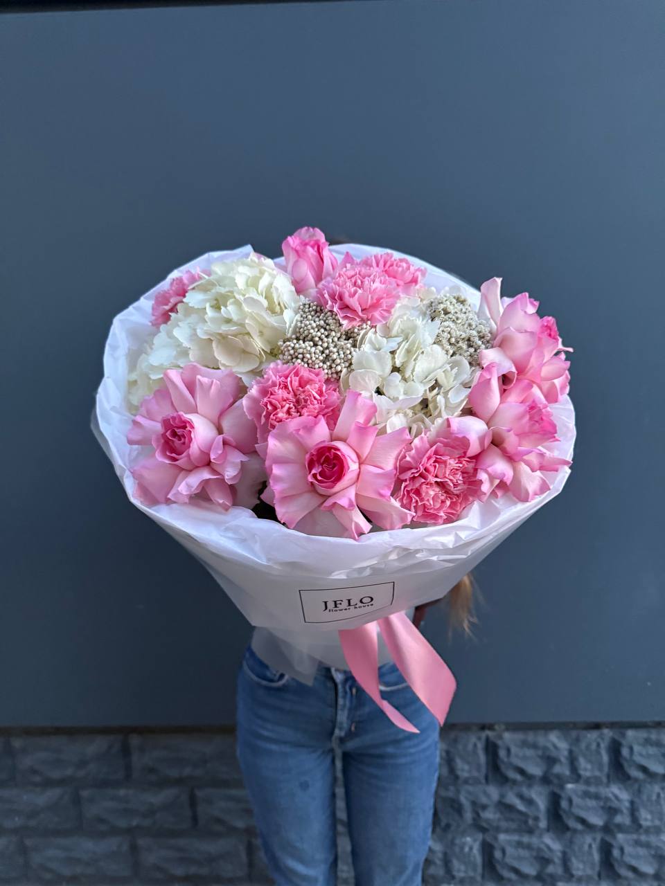 Пышная гортензия соседствует с крупными бутонами роз и многослойной эустомой. Веточки эвкалипта придают свежесть всей композиции. Букет с выразительным объемом и природной гармонией форм.