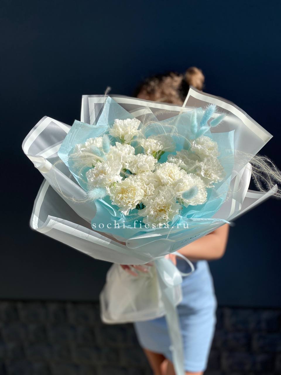 15 белых диантусов,ковыль,лагурус, эвкалипт, лента, дизайнерская пленка.
