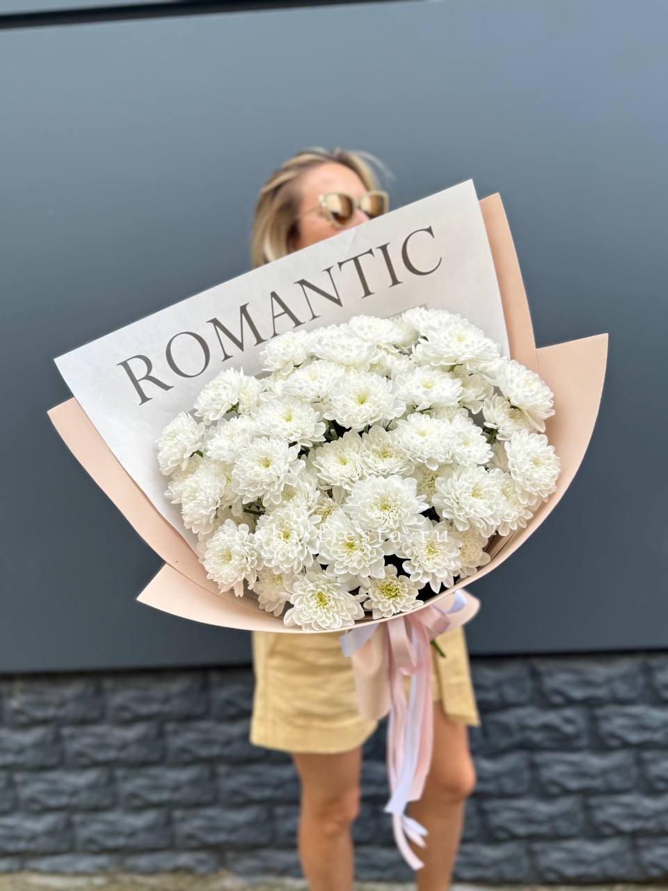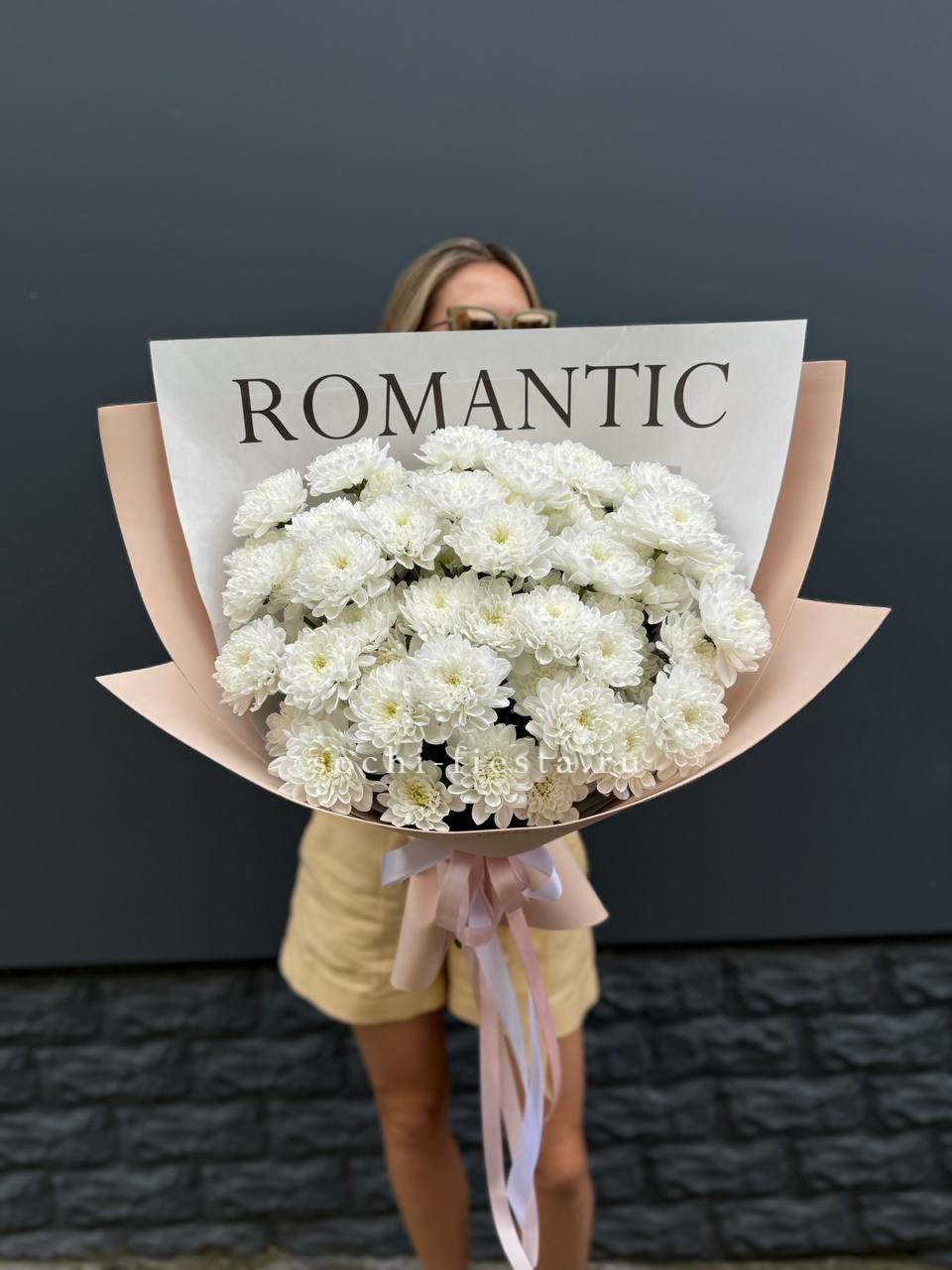Пятнадцать веток кустовых хризантем с множеством бутонов создают пышную композицию с воздушной фактурой. Оформление из фоамирана добавляет букету завершенность и мягкий силуэт.