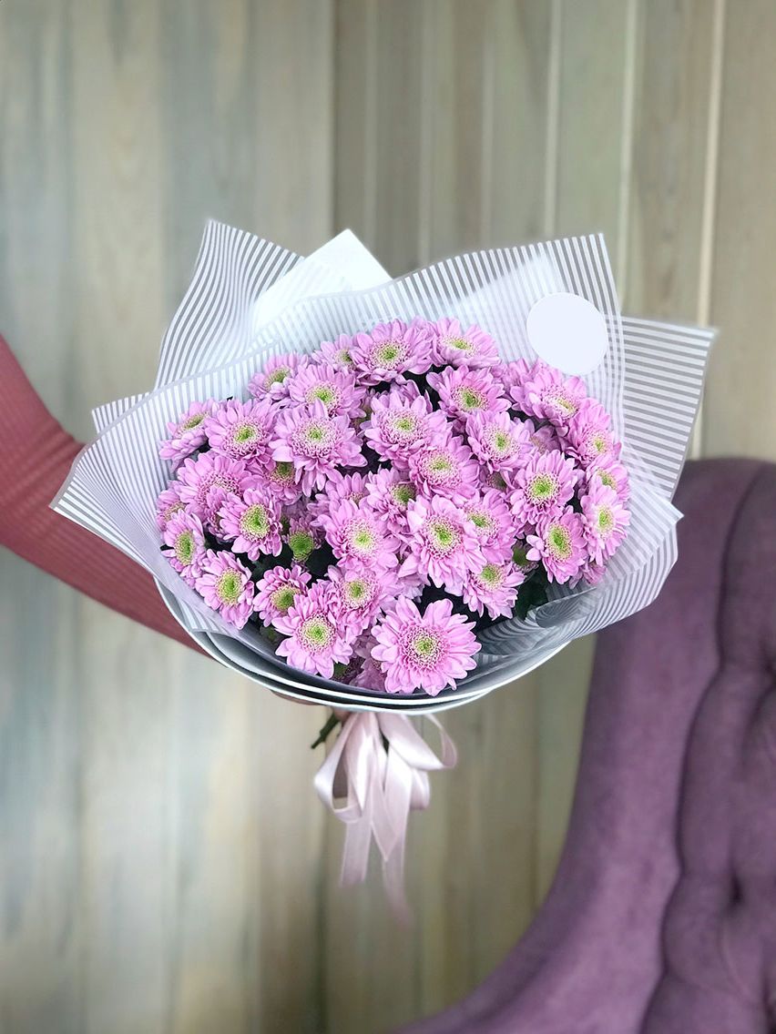 розовая кустовая хризантема - 9 веток, лента, дизайнерская упаковка.
