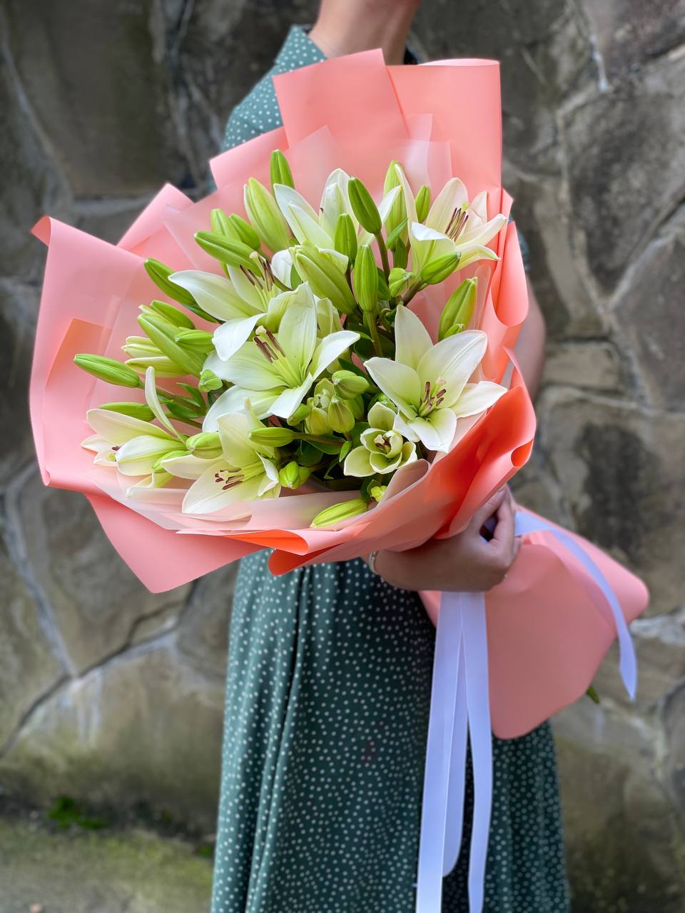 Пионовидные лилии с махровыми бутонами дополнены воздушным лимониумом. Девять стеблов образуют пышную форму, где каждый цветок раскрывается слоями.