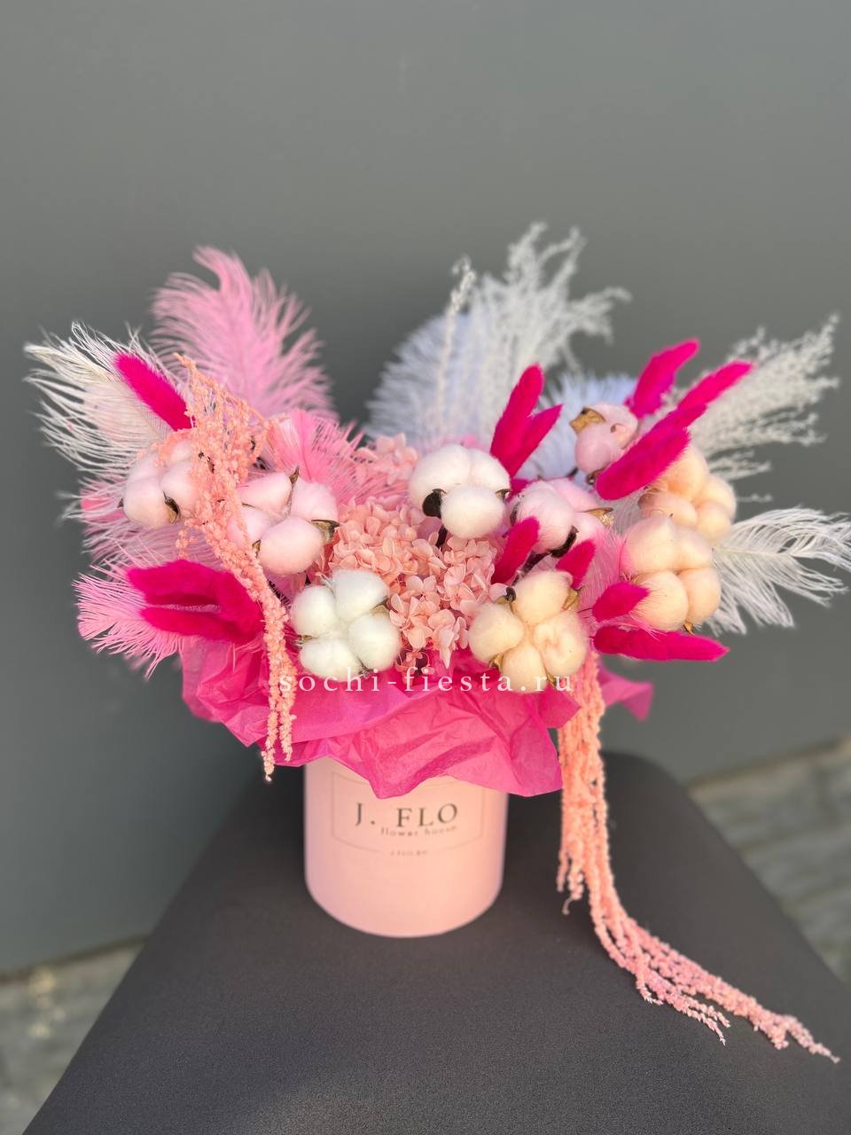 Композиция в цилиндре с лагурусом, хлопком и амарантом создает впечатление природной гармонии. Перья вносят легкость. Удобна в размещении и долго сохраняет первоначальный вид.