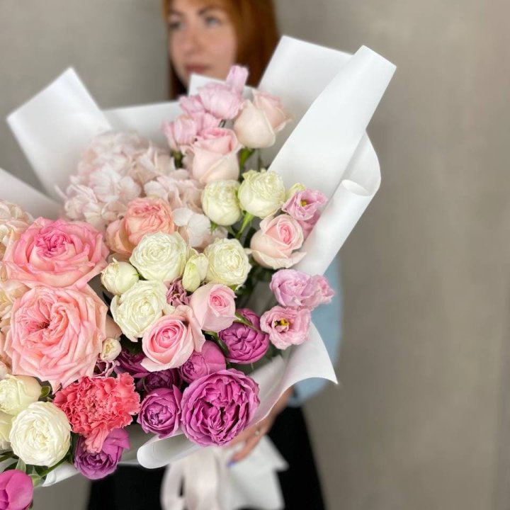 - Редкий состав — David Austin, ранункулюс, анемоны, сезонные пионы.