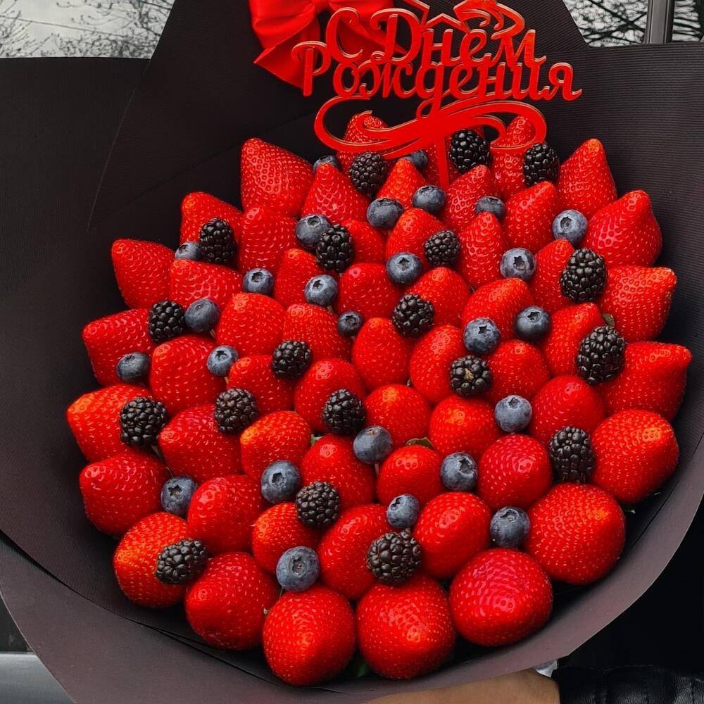Килограмм спелой клубники соседствует с тёмными ягодами голубики или ежевики. Композиция собрана плотно и держит форму за счёт ленты и продуманного оформления.