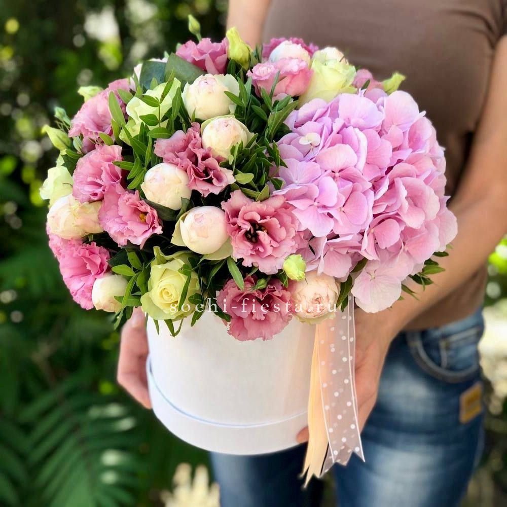 эустома, гортензия, белая роза, диантус, статица, бомбастик, бокс.