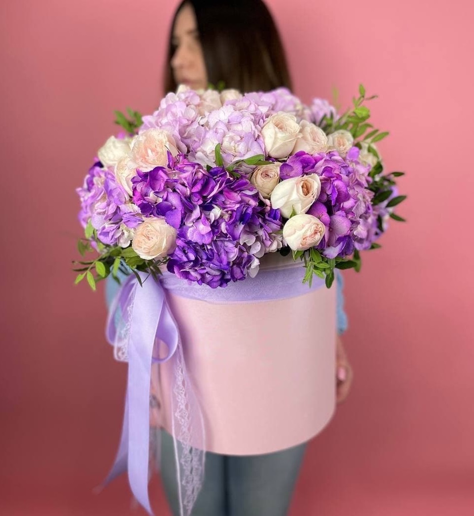 Белоснежные розы и воздушная эустома соседствуют с пышной гортензией и яркими вспышками статицы. Композиция собрана плотно, каждый цветок находит своё место в общем ритме.