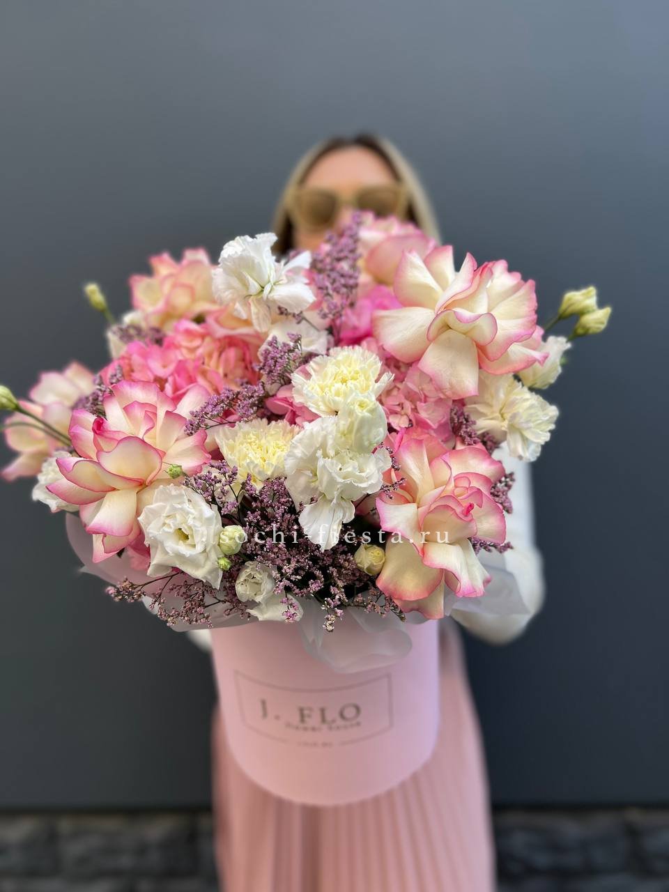 Белые французские розы раскрываются крупными бутонами и соседствуют с воздушной эустомой. Композиция создает ощущение легкости и света.