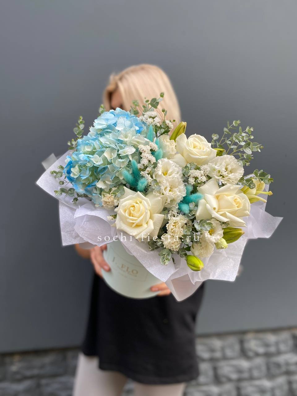Белые лилии и кустовая роза встречаются с лотосом и диантусом в небольшом боксе. Эвкалипт добавляет свежести легкой водной палитре.