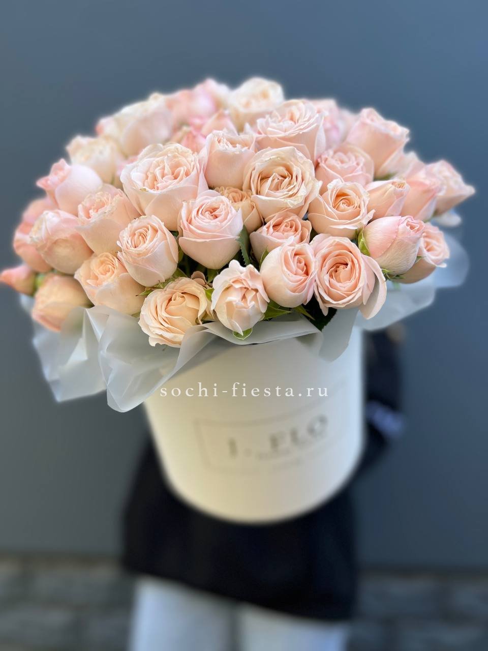 Тридцать одна веточка кустовой розы Бомбастик собрана в пышный объём. Махровые бутоны формируют dense структуру с глубокими переливами персиковых тонов.