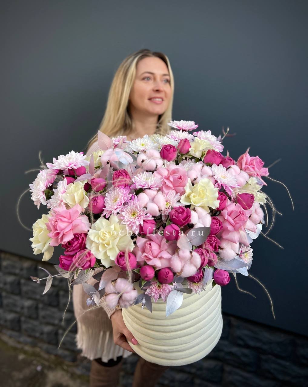 Широкий бокс объединяет пионовидные розы с пушистыми головками хлопка и воздушными метелками ковыля. Композиция построена на слоях: плотные бутоны у основания переходят в легкие текстуры по краям.