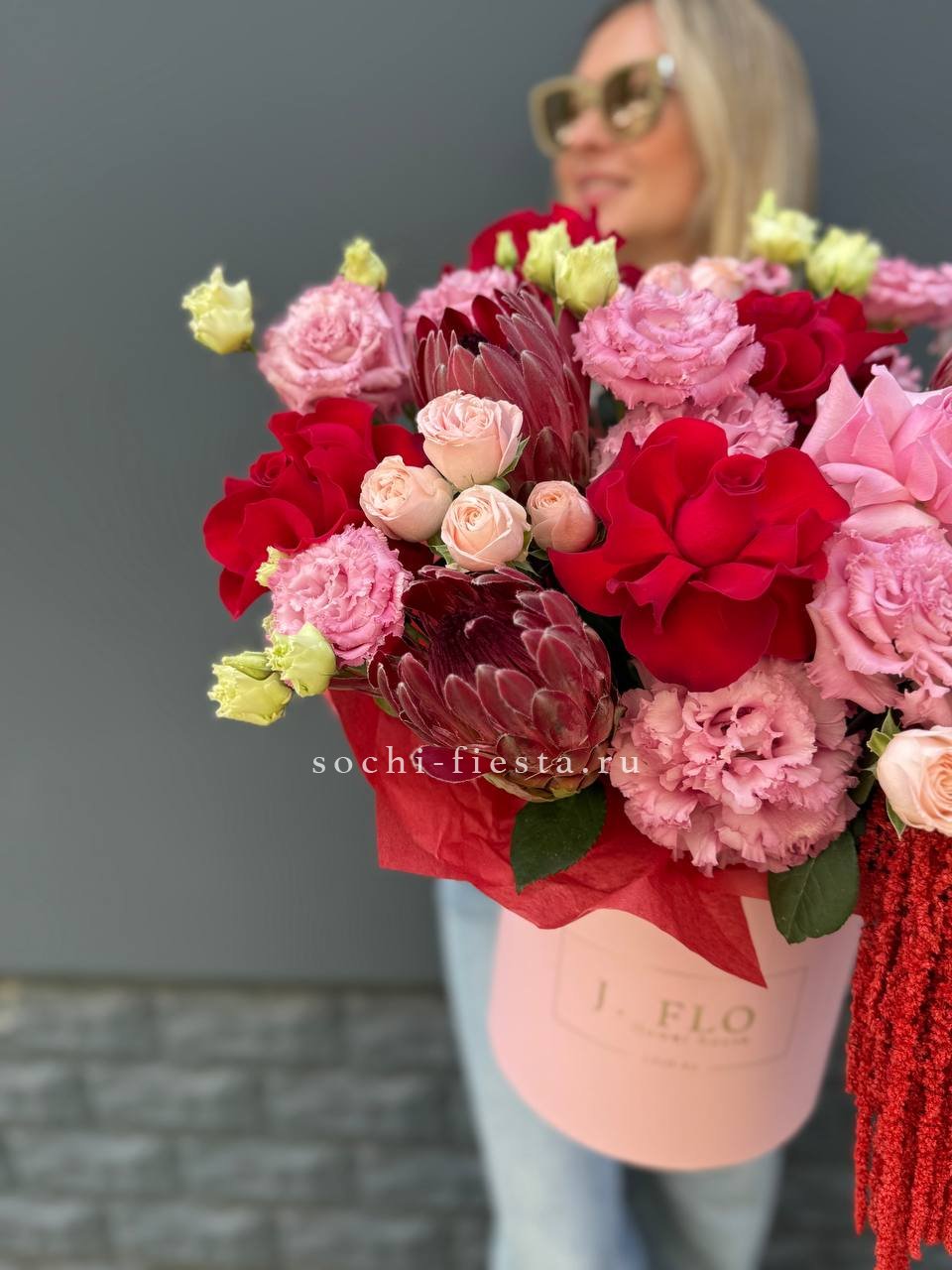 Яркая композиция объединяет экзотическую протею, солнечные герберы и пышные розы в одном насыщенном ритме. Каждый бутон раскрывается по-своему, создавая живую палитру теплых оттенков.