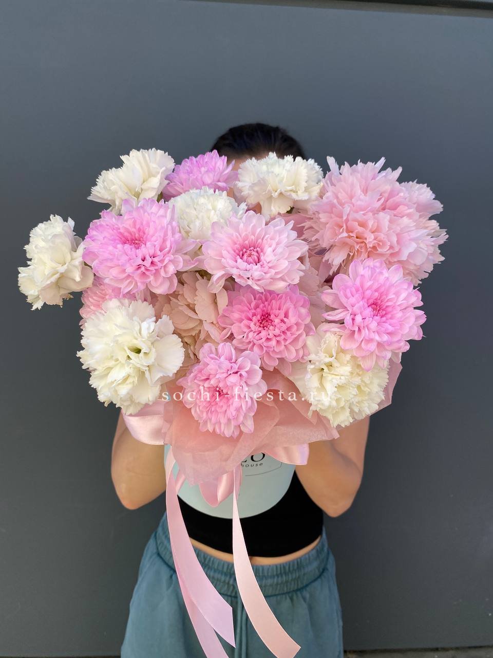хризантемы, диантусы, пионы, цилиндр D13, эвкалипт, лента, тишью.