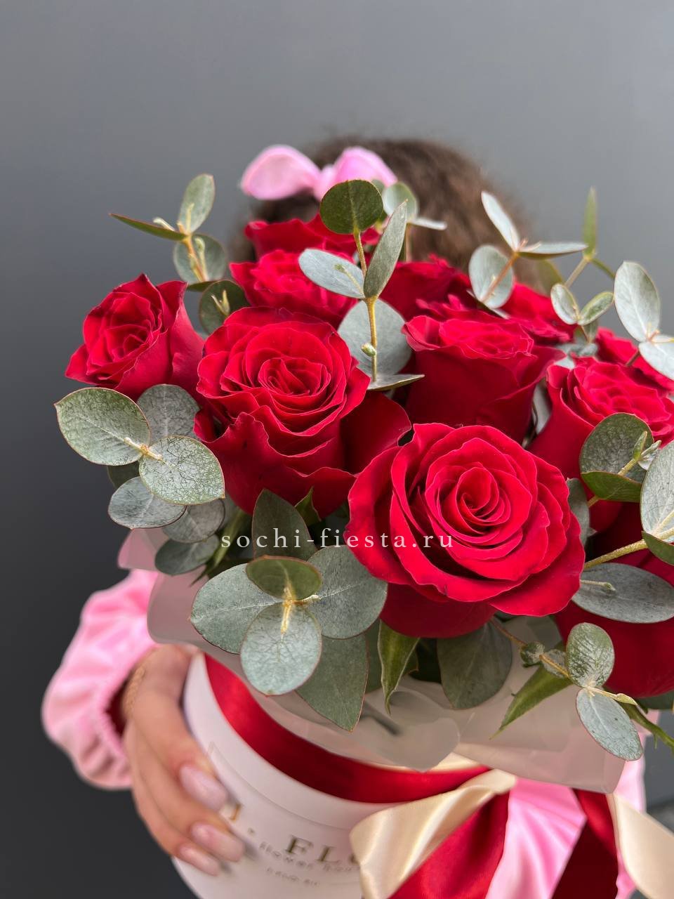 Пятнадцать красных роз уложены ровным куполом в круглом цилиндре. Ветки эвкалипта обрамляют бутоны и добавляют зеленые акценты по краю композиции.