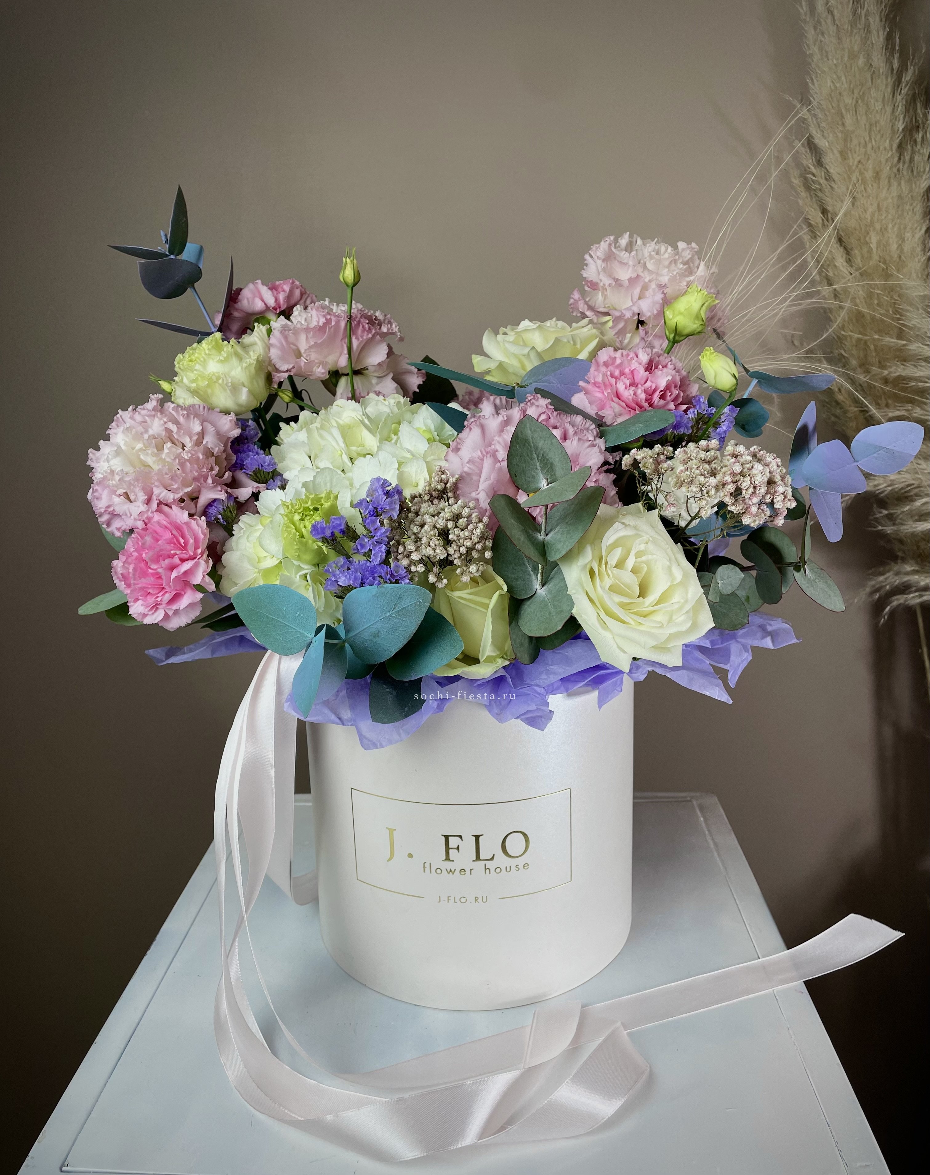 Воздушные соцветия мисти баблс собраны в компактную композицию с мягкими серо-зелеными оттенками. Миниатюрный эвкалипт добавляет свежести и завершает образ.