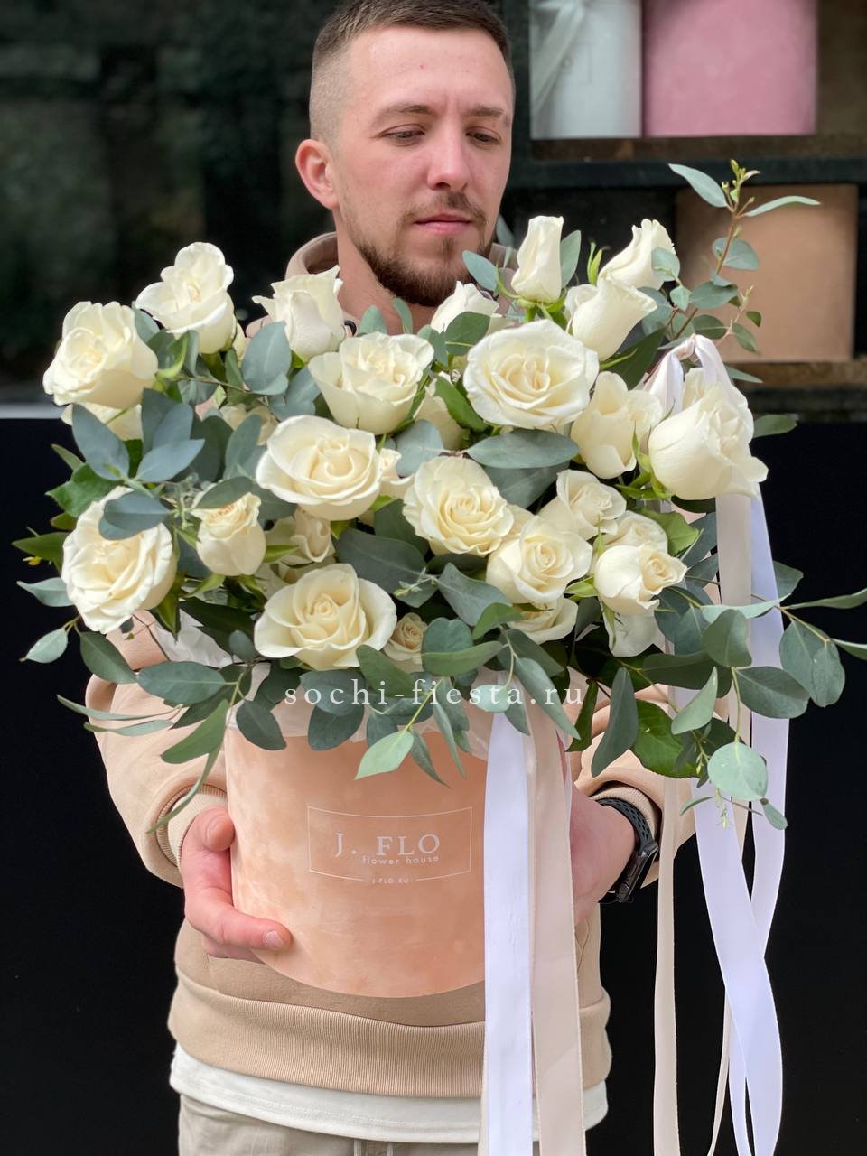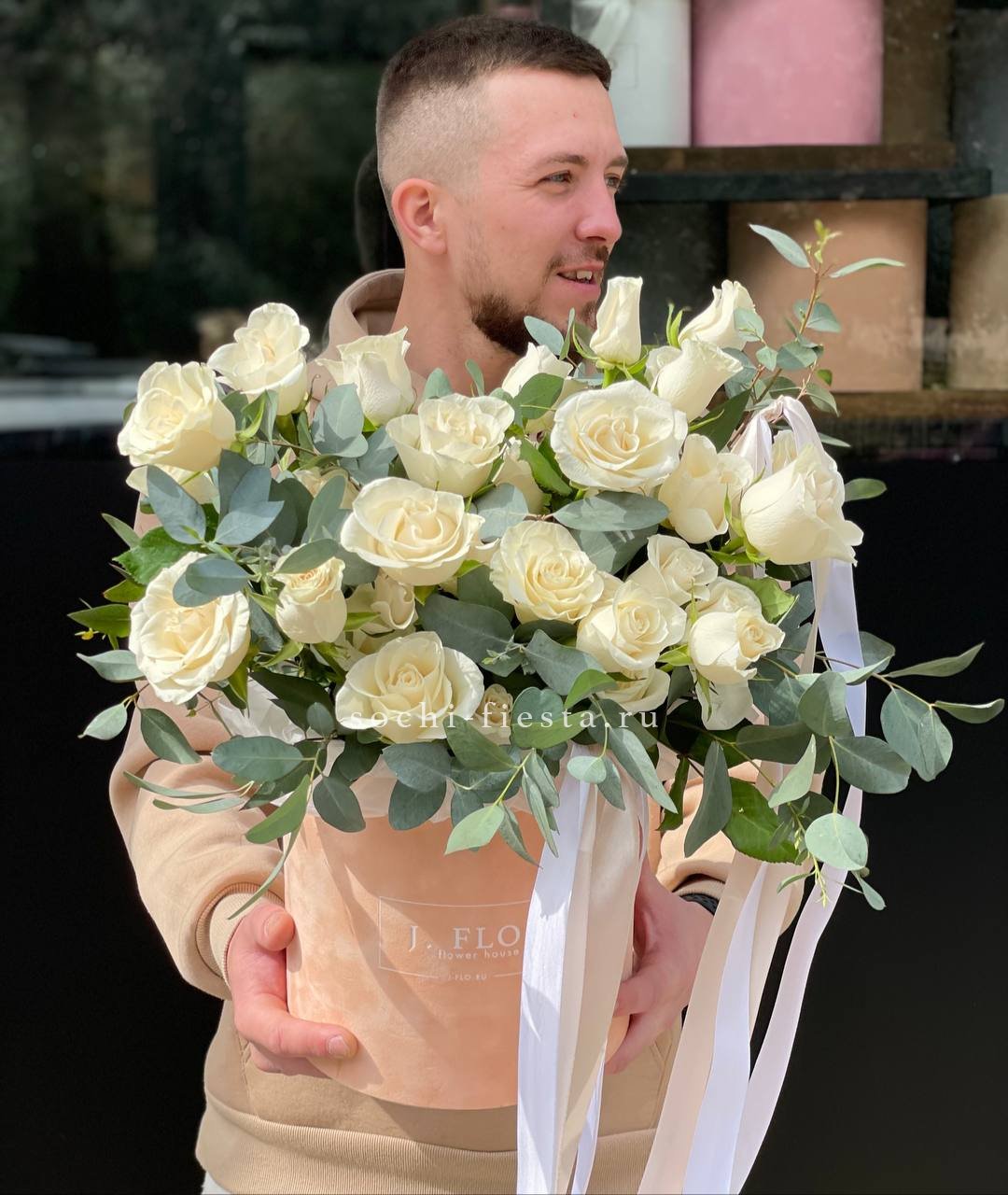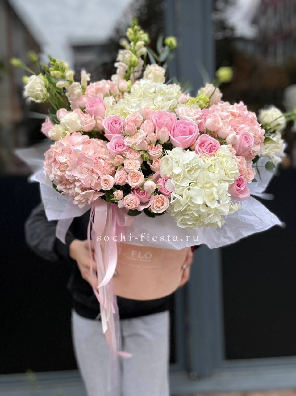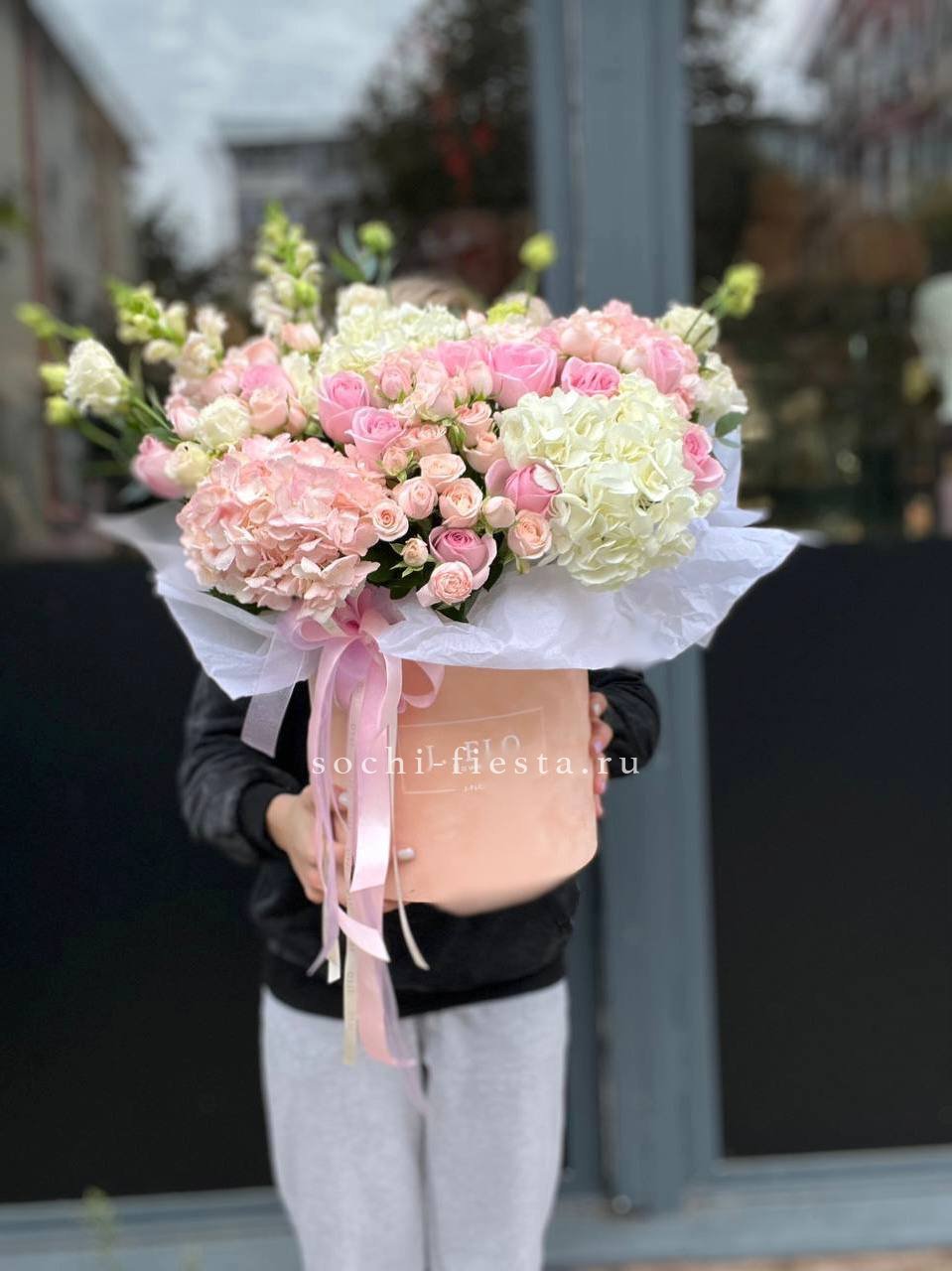 роза, диантус, пионы или гортензия, розы, бомбастик, эустома, декоративная зелень, цилиндр D16.