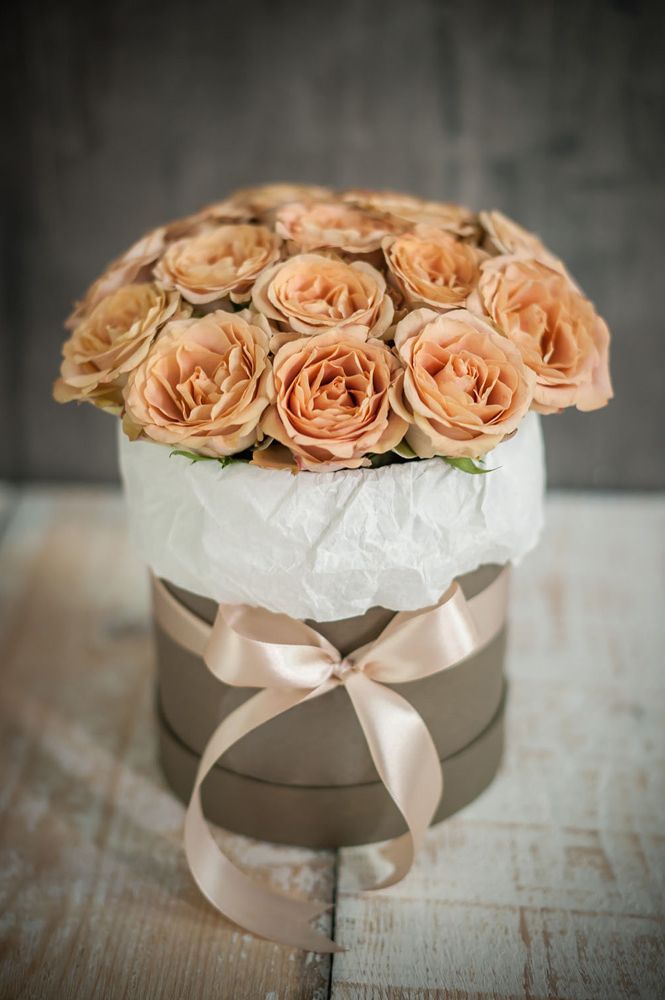 Розовая палитра переходит от французских роз к кустовым Джульетта с добавлением хлопка. Композиция в цилиндре сочетает воздушность и плотность фактур.