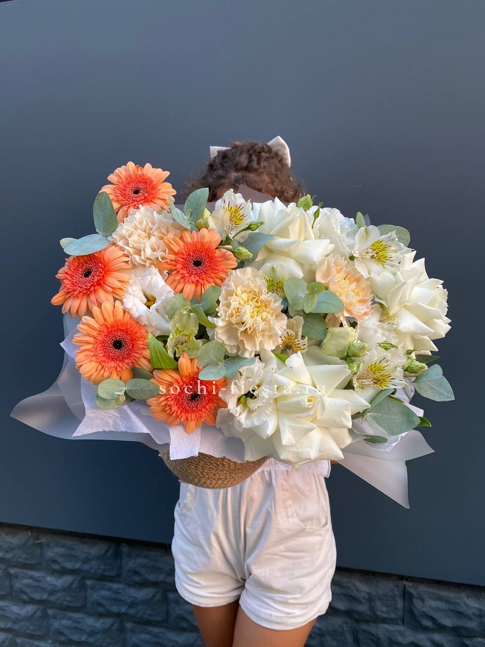 Белые розы и яркие герберы встречаются в одной композиции с диантусами и эустомой. Эвкалипт добавляет зелени, а джутовое кашпо завершает природный образ букета Georgino.