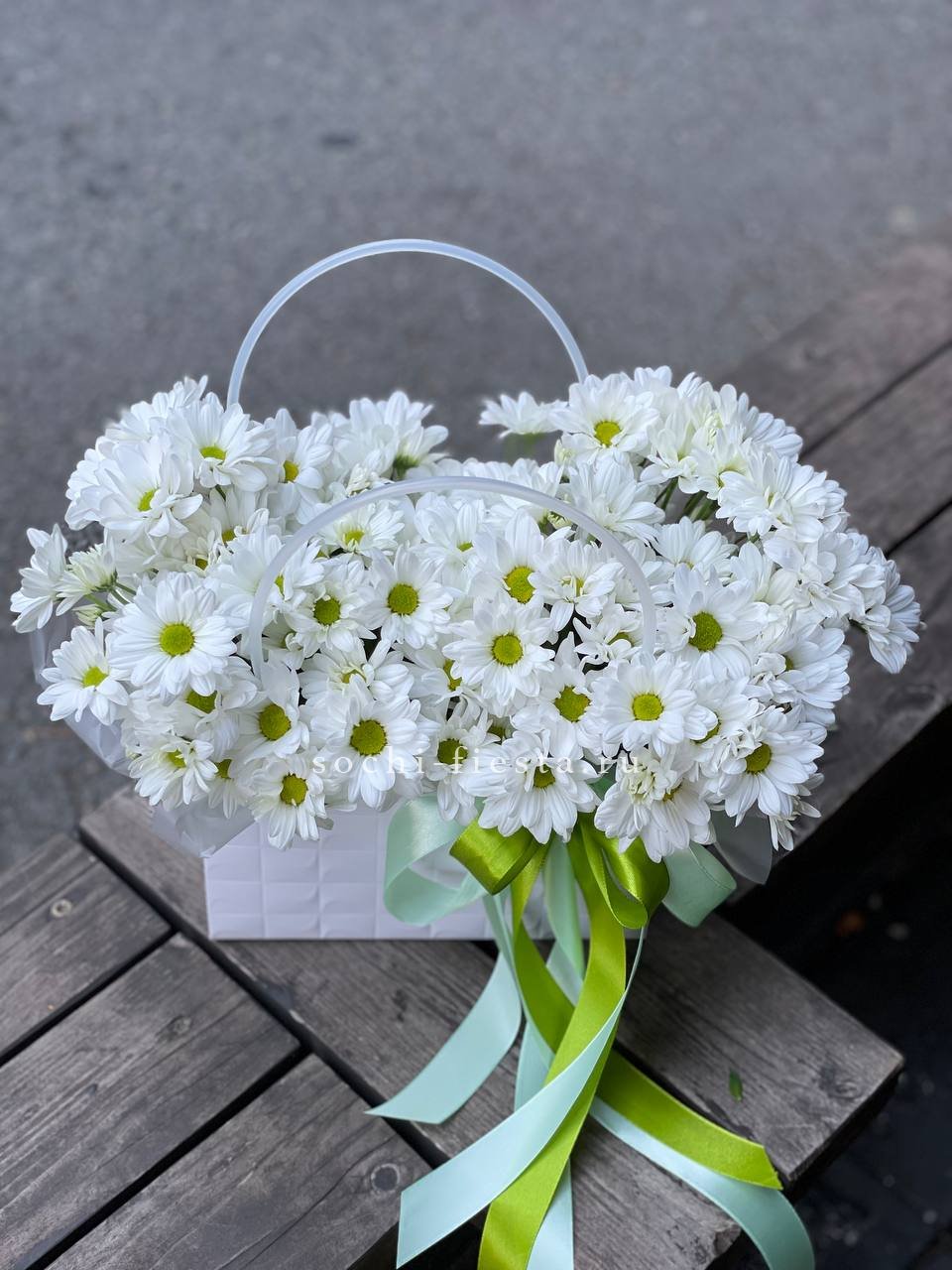 Белые хризантемы-ромашки собраны плотной шапкой и обрамлены легкими складками тишью. Простая графичная форма в удобной сумке подходит для любого интерьера.