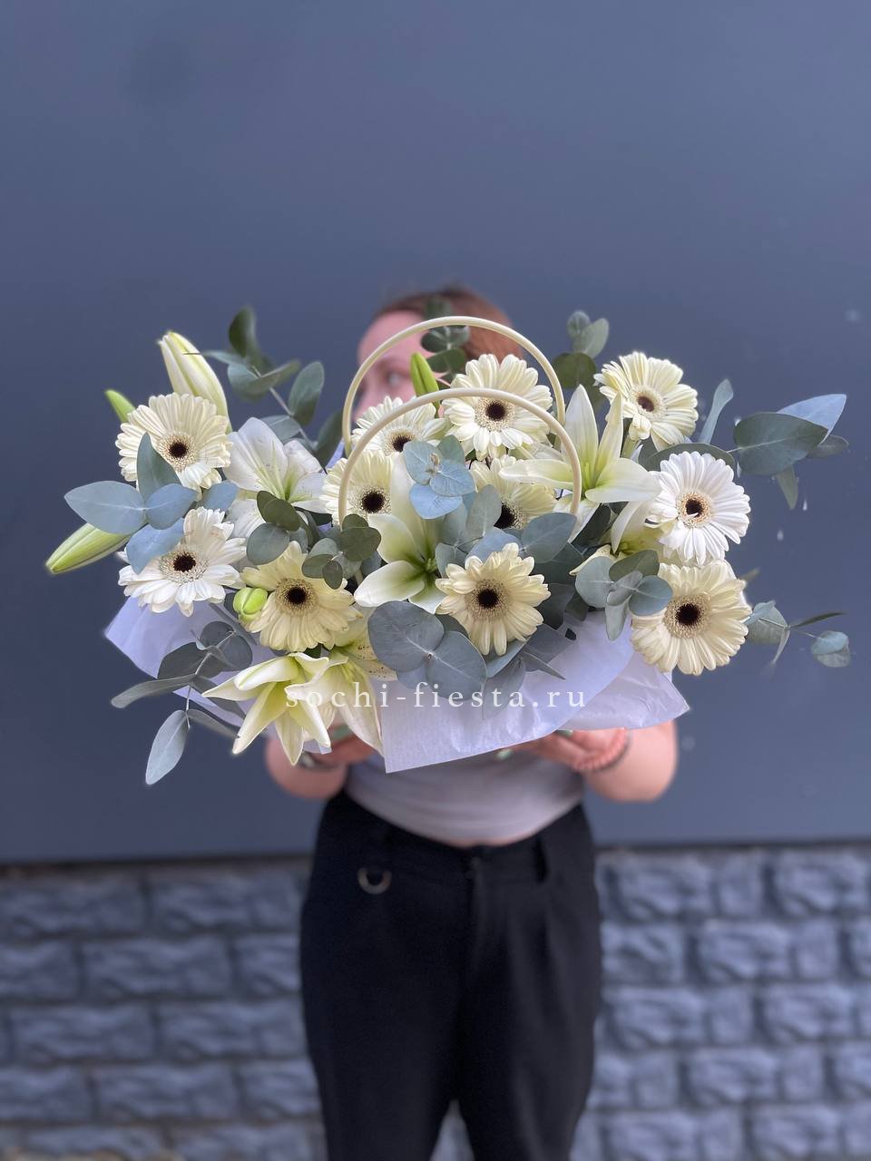сумочка в белых тонах с лилией, герберой и эвкалиптом.