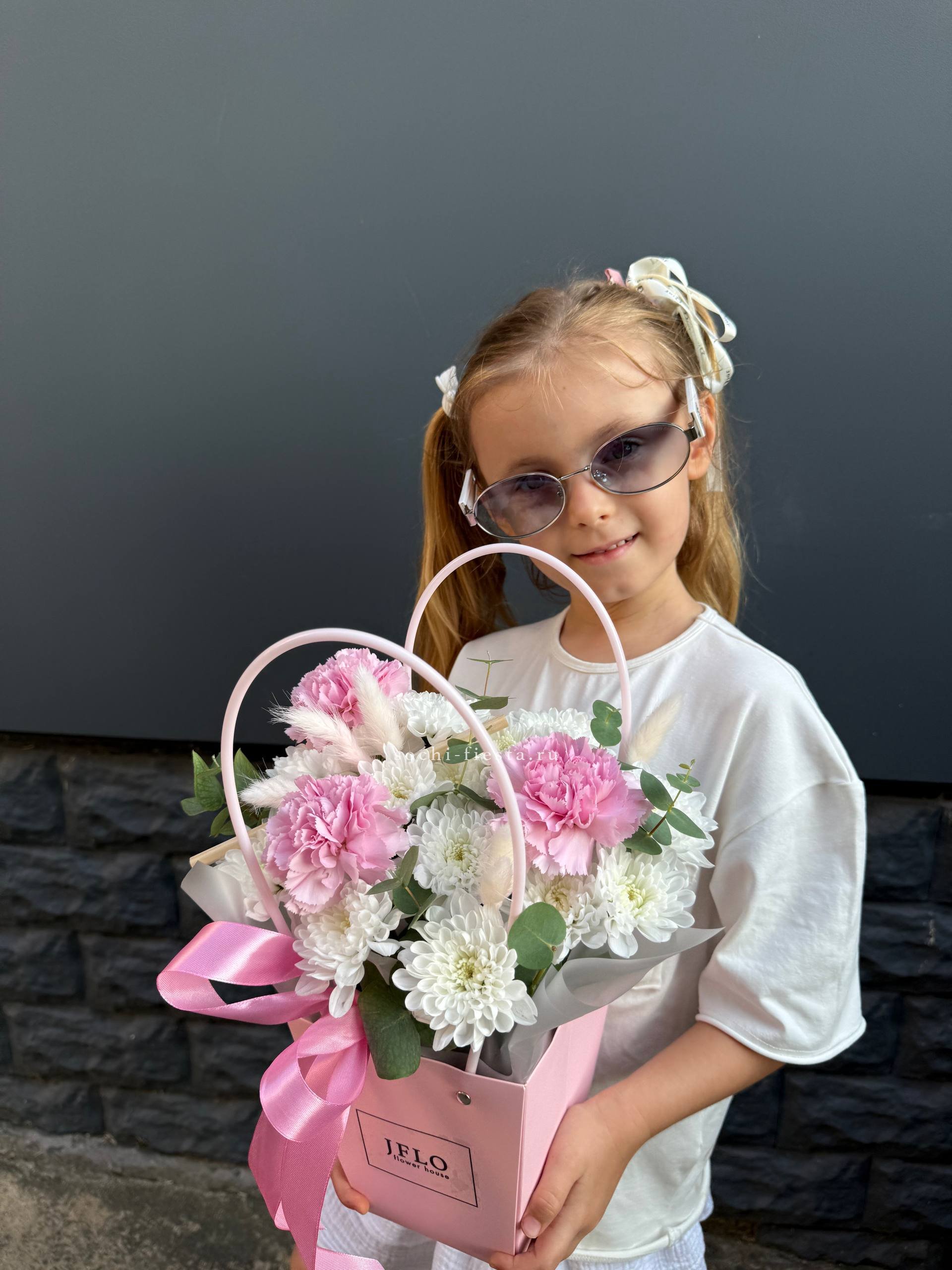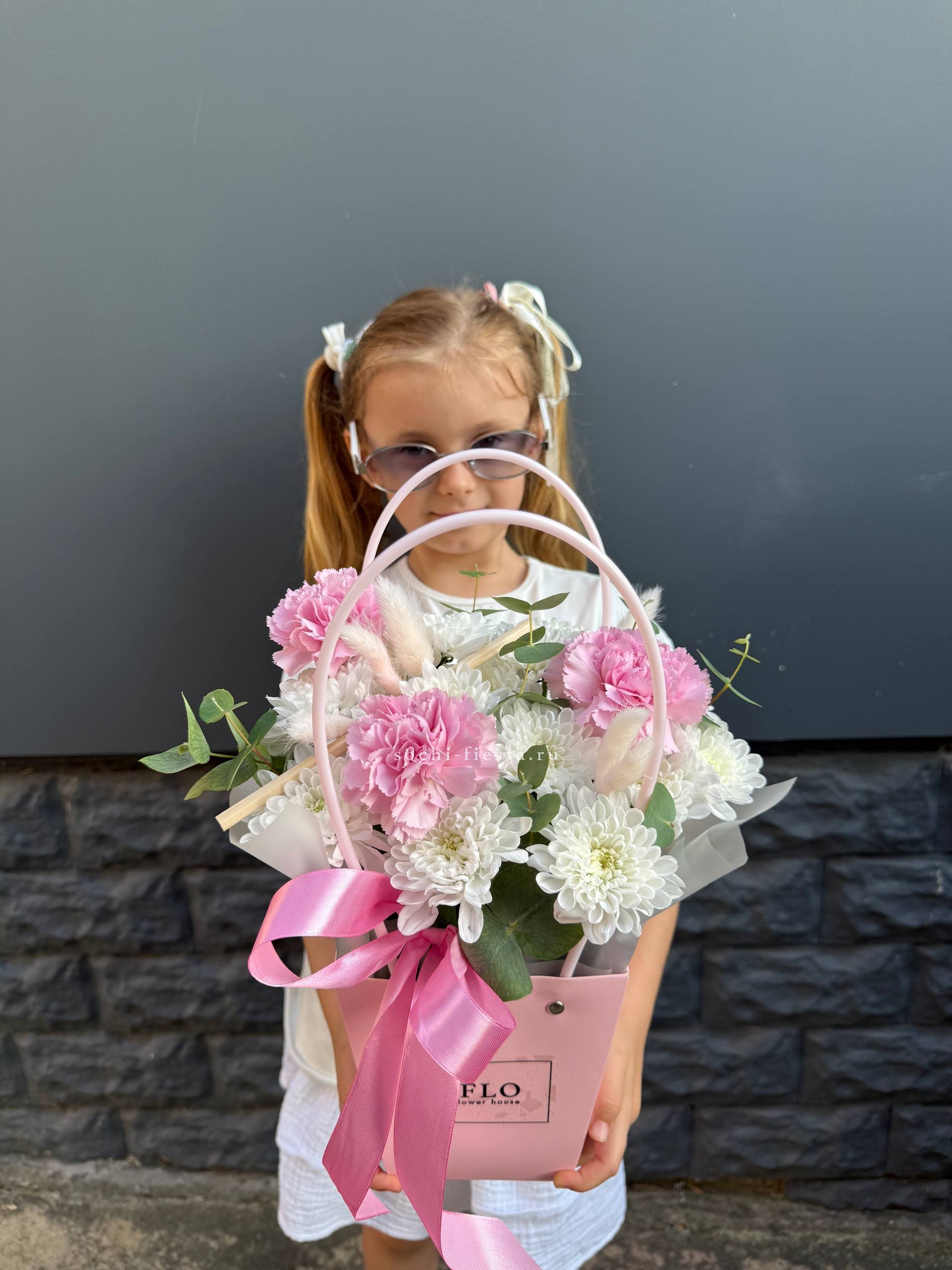 Яркая композиция в удобной сумочке объединяет розы Джумилия с герберами и воздушными соцветиями. Хлопок и лагурус добавляют природной легкости, а диантус создает цветовую динамику.