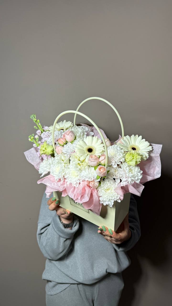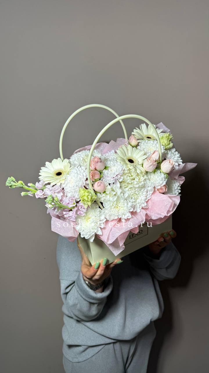 сумочка с гортензией, мисти баблс, герберой, озатамусом и эвкалиптом.