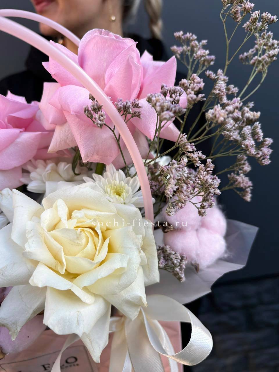 сумочка, хризантема, розовые розы, диантус, эвкалипт.