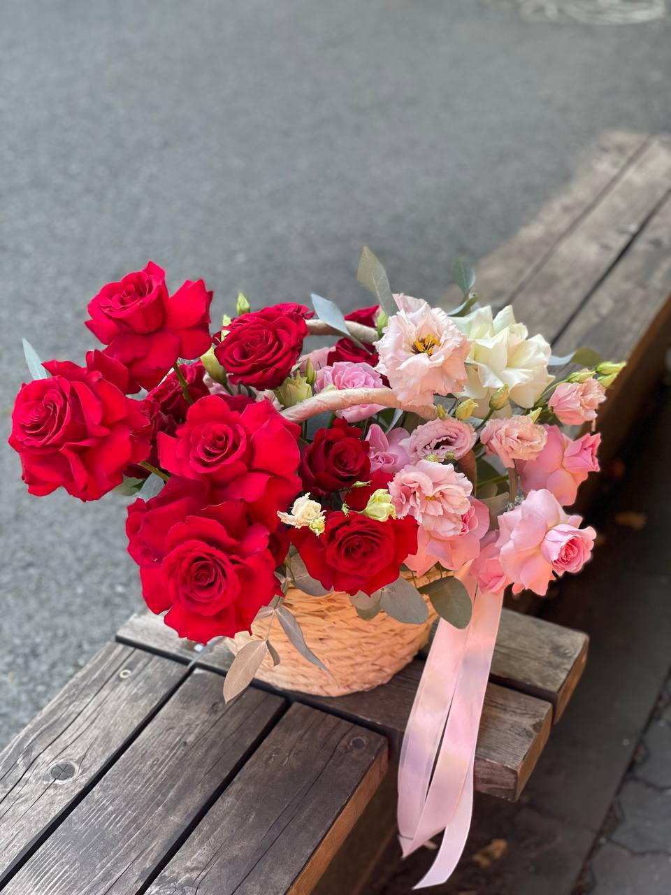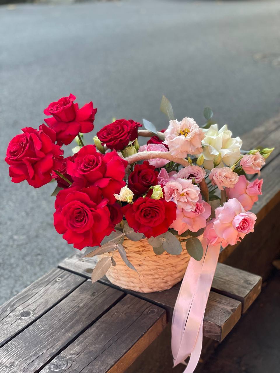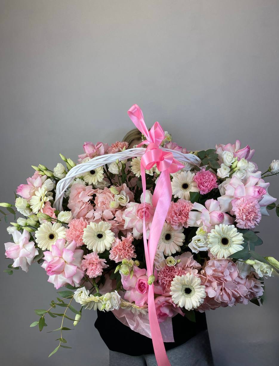 65 пионовидных кустовых роз Misty Bubbles, эвкалипт, светлая корзина.