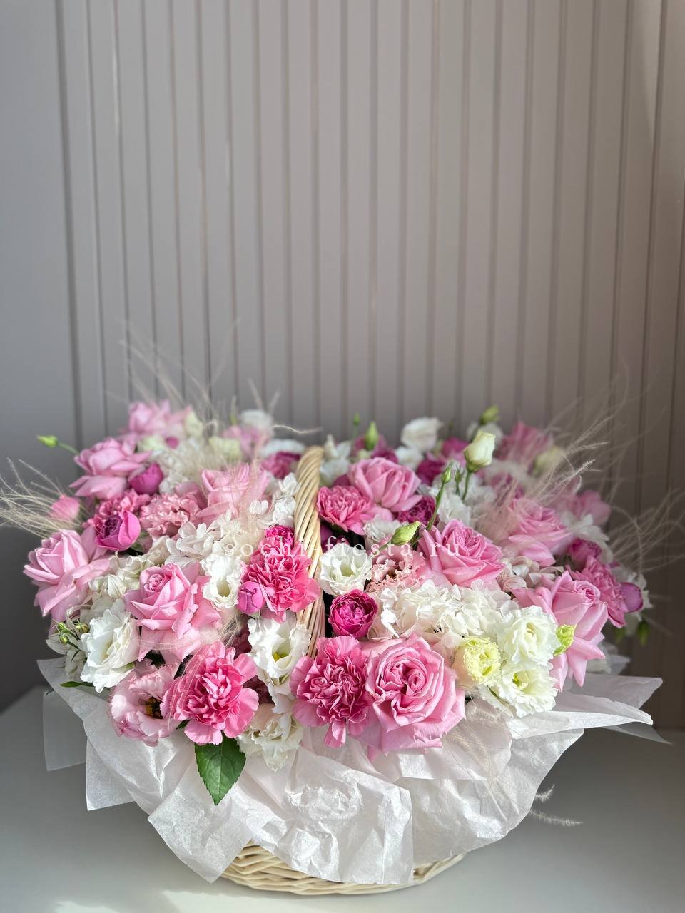 Сорок одна пионовидная роза в светлой корзине выстраивает объёмную композицию с мягкими переливами лилового и розового. Эвкалипт обрамляет густую россыпь бутонов.