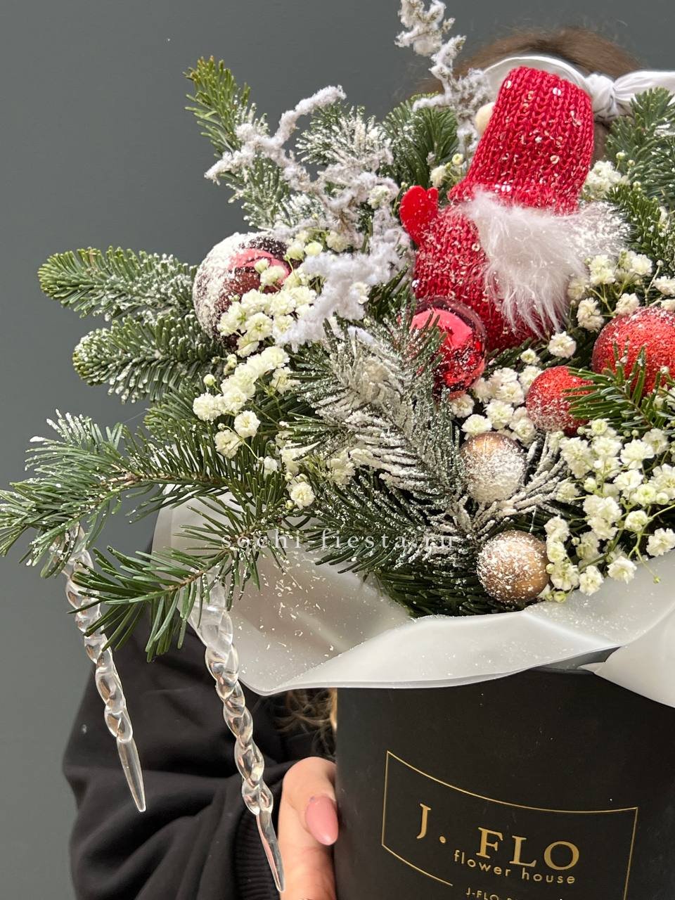 датский нобилис,  гипсофилы, красные игрушки, гном, шары, аспарагус (или аналог), сосульки ВНИМАНИЕ! Готовая композиция (декор) может иметь незначительные внешние отличия от примера на фотографии.