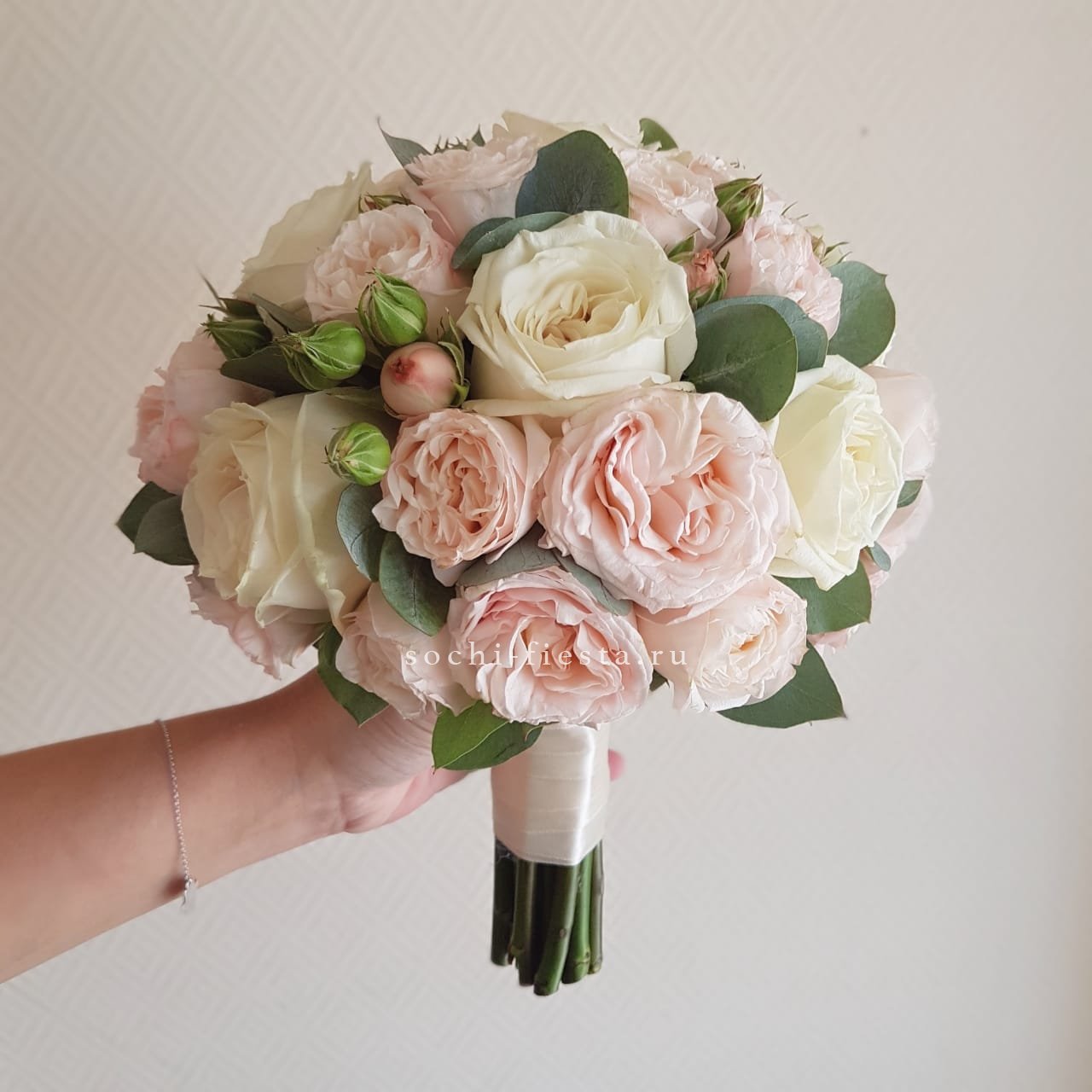 эустома, белые одноголовые розы, пионовидные кустовые кремовые розы Бомбастик, эвкалипт, лента, дизайнерская пленка комбинированная.