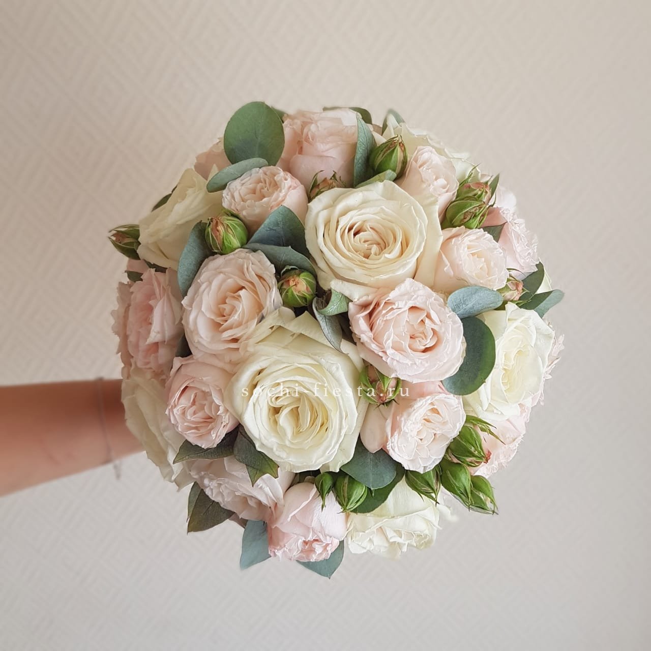 Кремовые и белые оттенки перетекают друг в друга, создавая мягкий переход без резких границ. Эвкалипт и дизайнерская упаковка завершают образ.