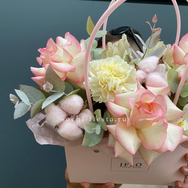Упаковка — бумажная рубашка с водяной колбой у стеблей, шёлковая или атласная лента. Шляпные коробки и корзины с флористической губкой. Для свадеб — индивидуальное оформление под стиль торжества.
