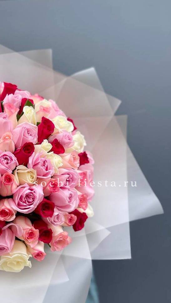 101 роза разноцветных оттенков, лента, упаковка на выбор.