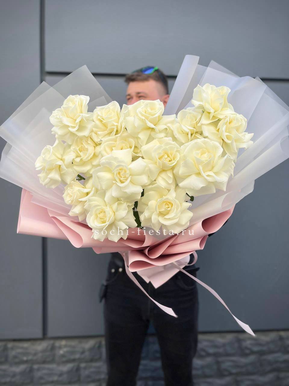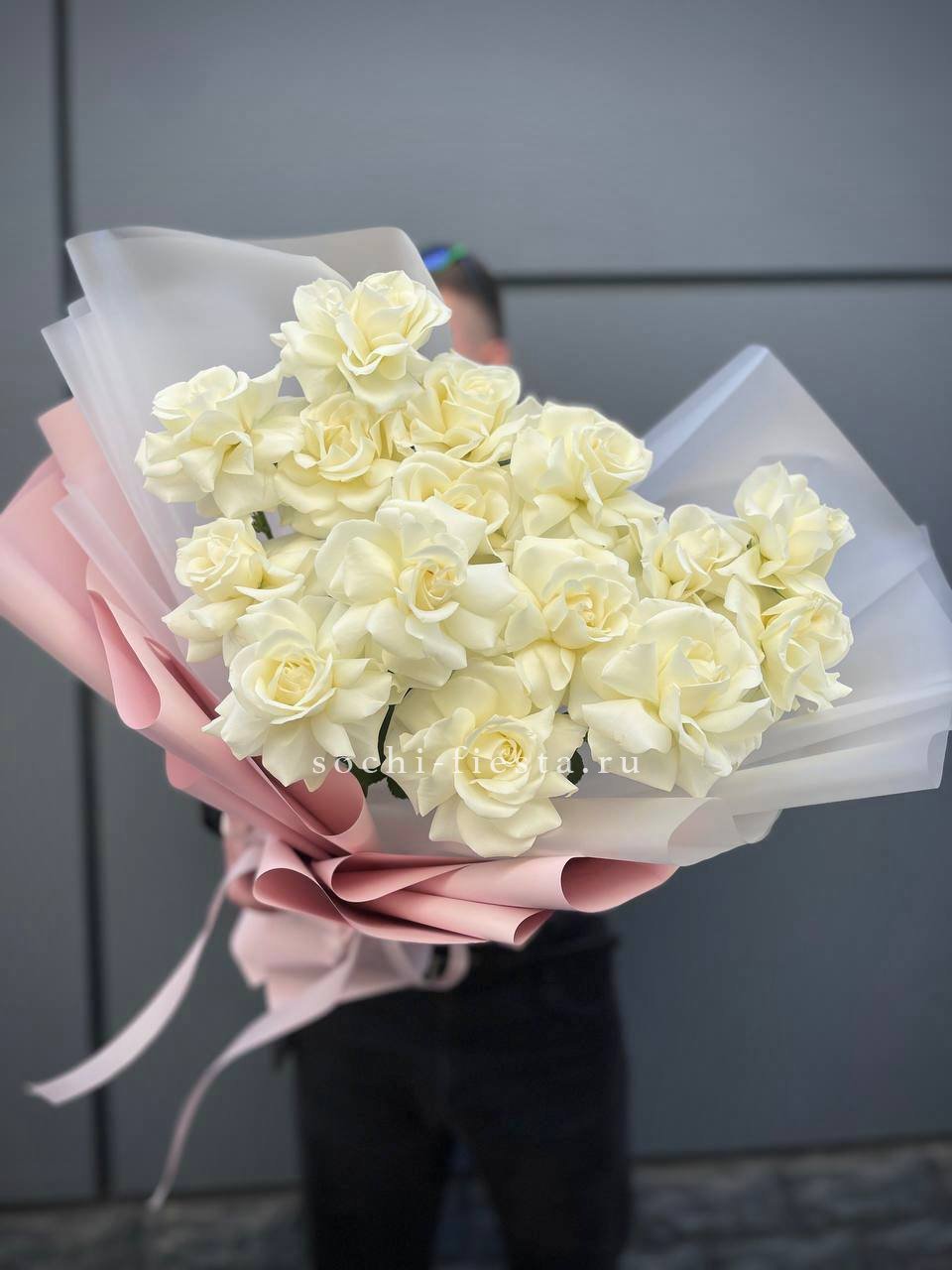 Пятнадцать белых роз в тонкой дизайнерской упаковке создают ощущение лёгкости и чистоты. Матовая текстура бумаги и мягкие складки подчёркивают форму каждого бутона. Композиция выглядит свежо и современно.