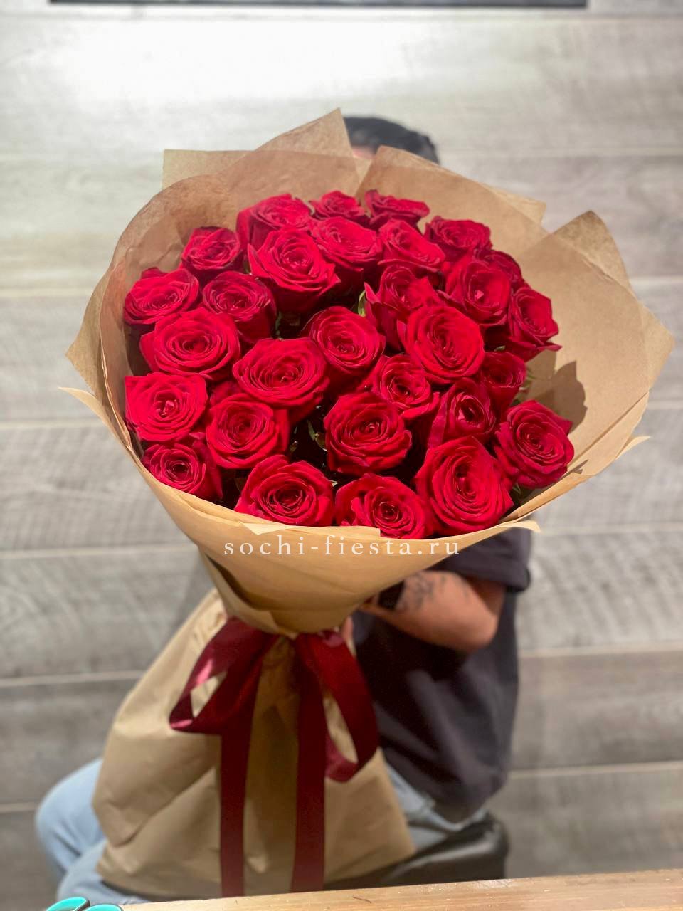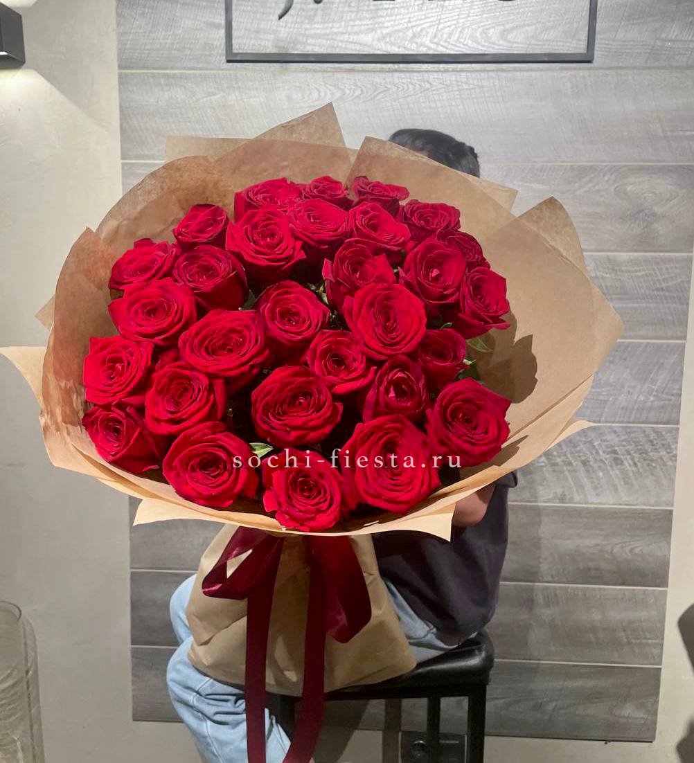 Плотная сборка из тридцати семи бутонов создает насыщенное красное пятно. Крафтовая обертка подчеркивает естественную фактуру лепестков. Букет держит форму и выглядит весомо.