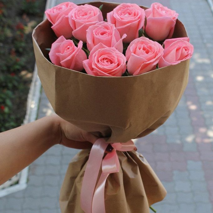 Девять бутонов собраны в компактную форму и обернуты крафтом. Розовый оттенок мягкий и натуральный. Букет занимает мало места и долго сохраняет свежесть.
