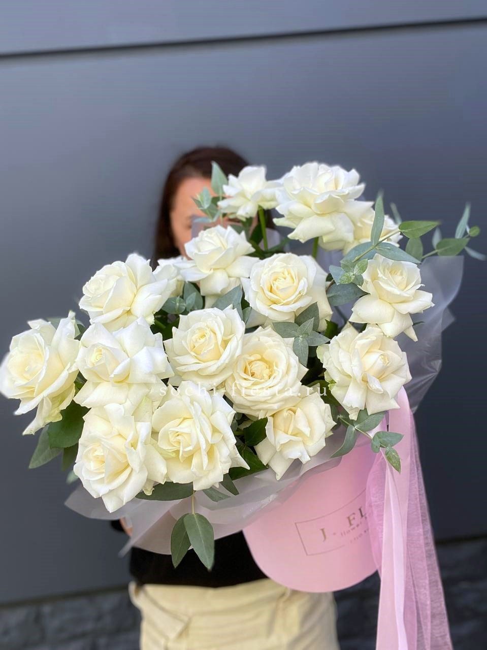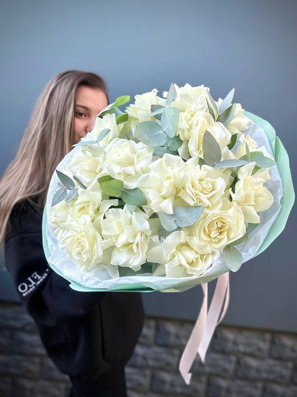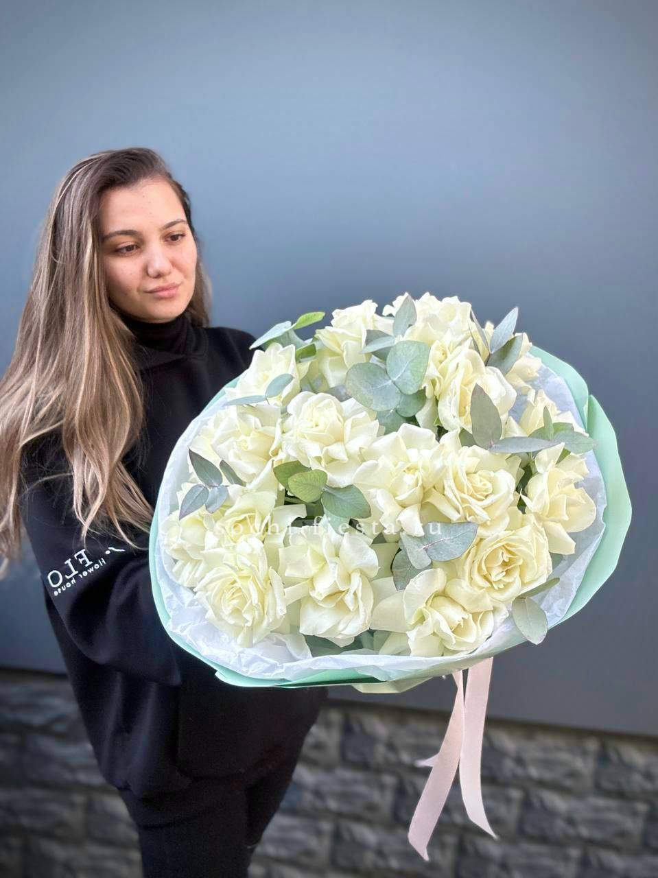 Пять французских роз с вывернутыми лепестками раскрываются широко и создают эффект лёгкой небрежности. Эвкалипт поддерживает форму и добавляет свежести белому цвету.