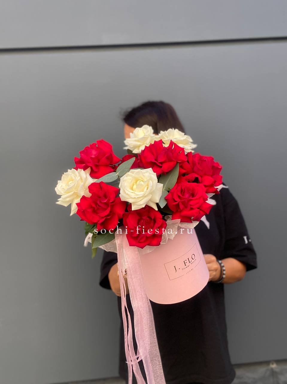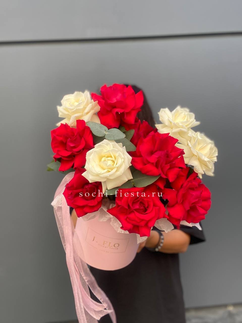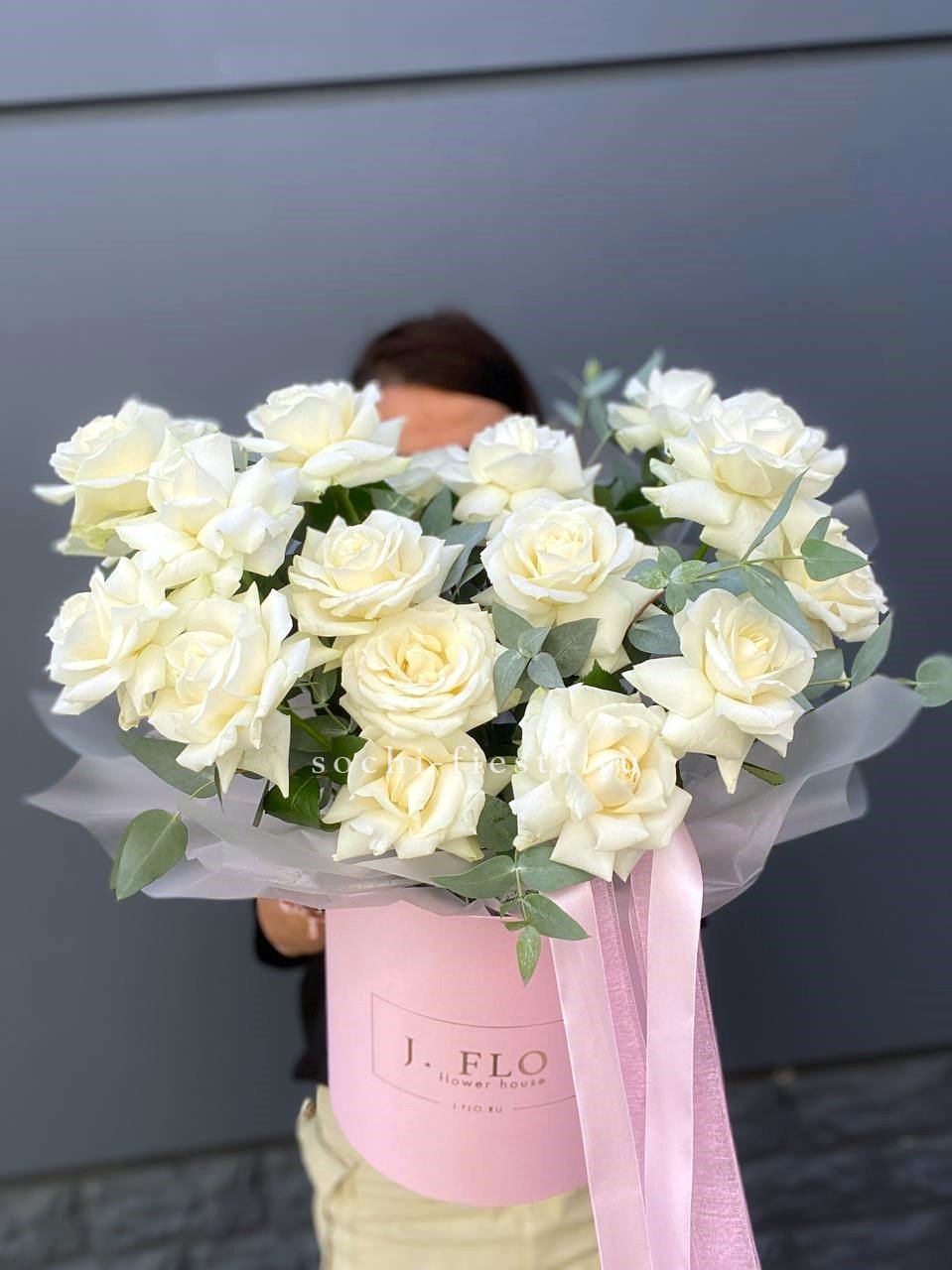 Пять французских роз с вывернутыми лепестками раскрываются широко и создают эффект лёгкой небрежности. Эвкалипт поддерживает форму и добавляет свежести белому цвету.