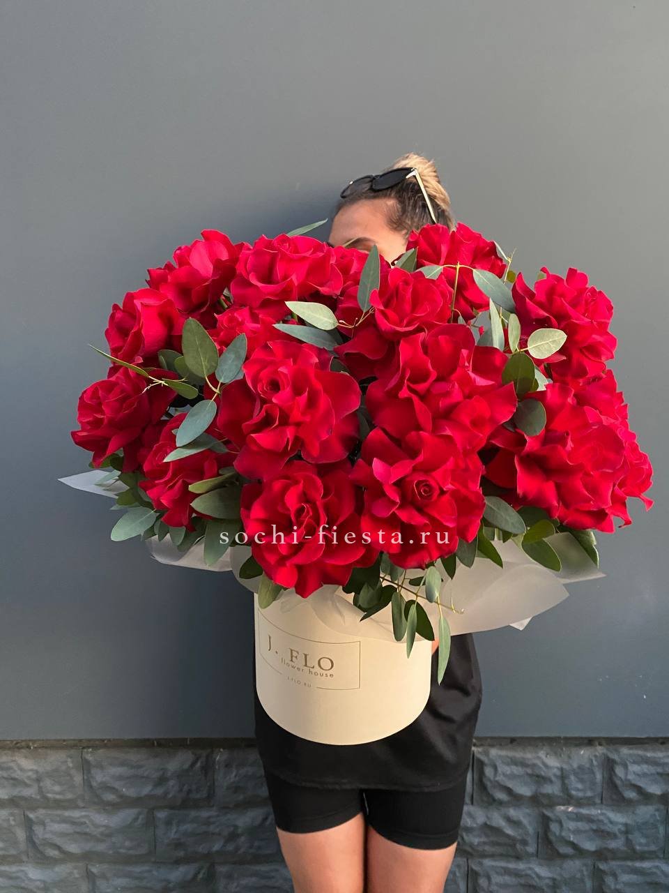 Семь вывернутых бутонов раскрываются широко и свободно, открывая слои белоснежных лепестков. Эвкалипт добавляет воздух и свежесть композиции.
