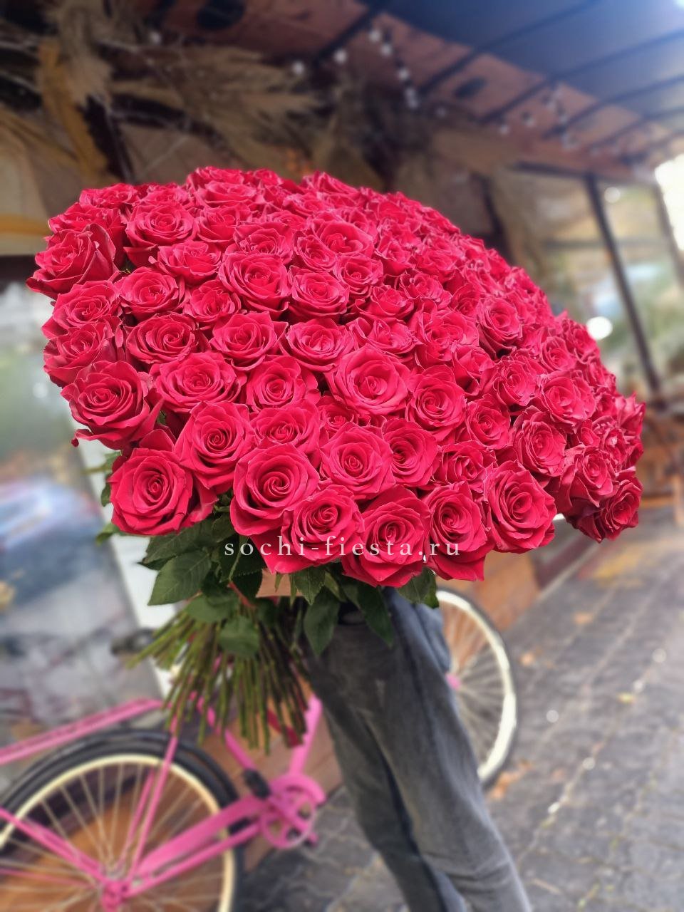 Сто одна роза в плотной охапке создает объемное облако цвета и движения. Розовый оттенок наполняет пространство мягким свечением, а высота букета позволяет ему доминировать в любом интерьере.