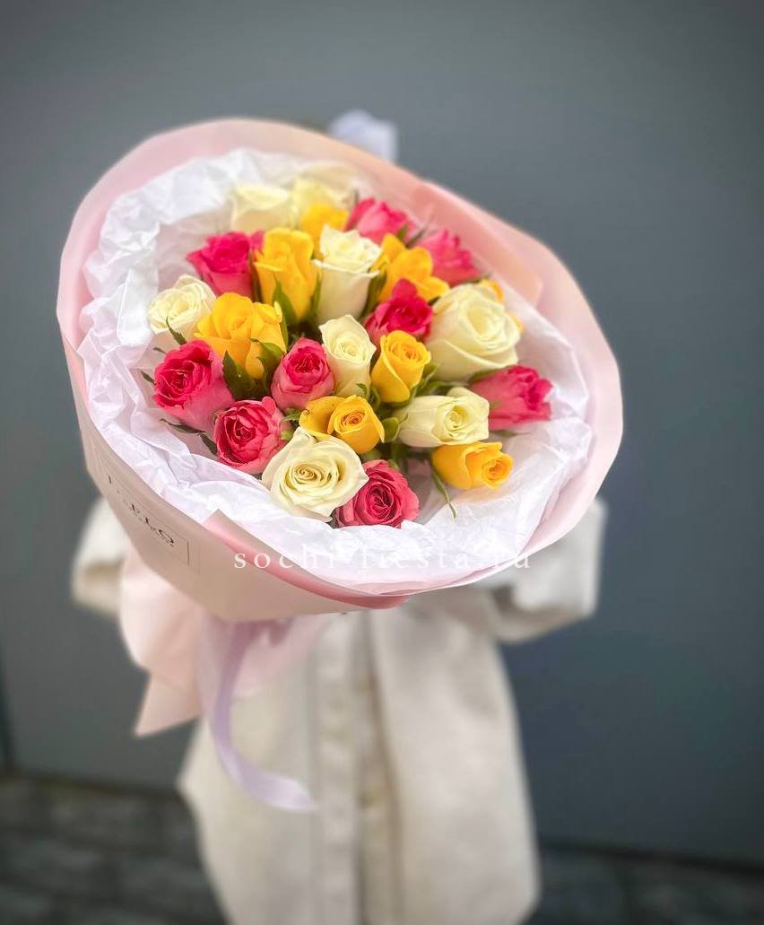 Разноцветные головки роз собраны в яркую композицию, где оттенки переплетаются без строгого порядка. Каждый бутон добавляет свой тон в общую палитру. Микс, который звучит живо и непредсказуемо.